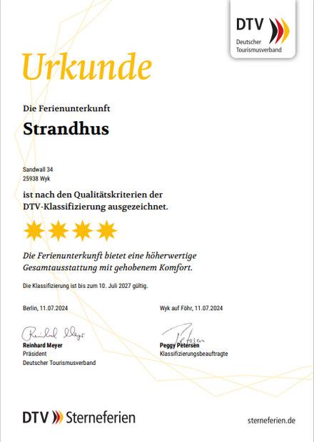 Das Strandhus wurde 2024 erneut vom Deutschen Tourismus Verband (DTV) klassifiziert und erhielt die begehrte 4-Sterne-Auszeichnung – ein Garant für Komfort und Qualität.