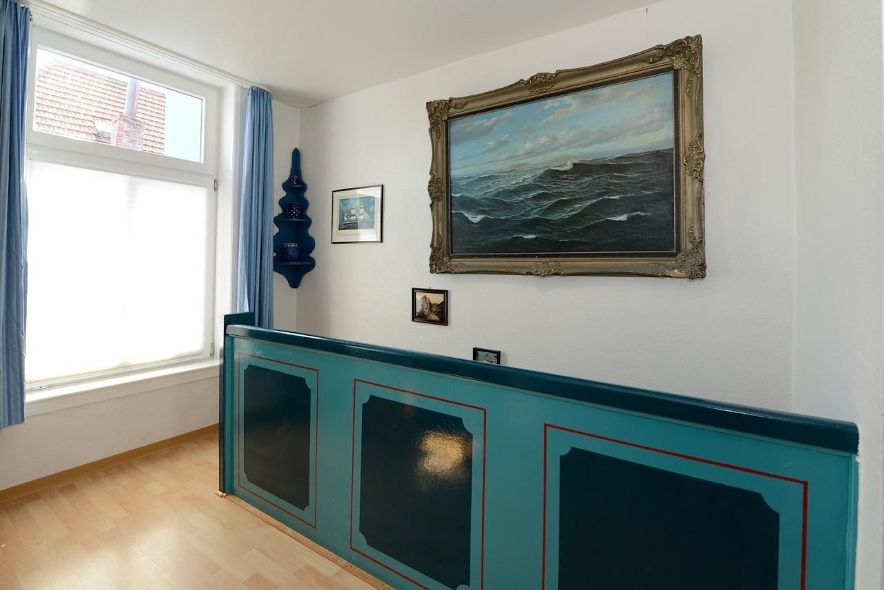 Der Treppenaufgang ist im typischen Friesenblau gehalten – ein wahrer Blickfang!