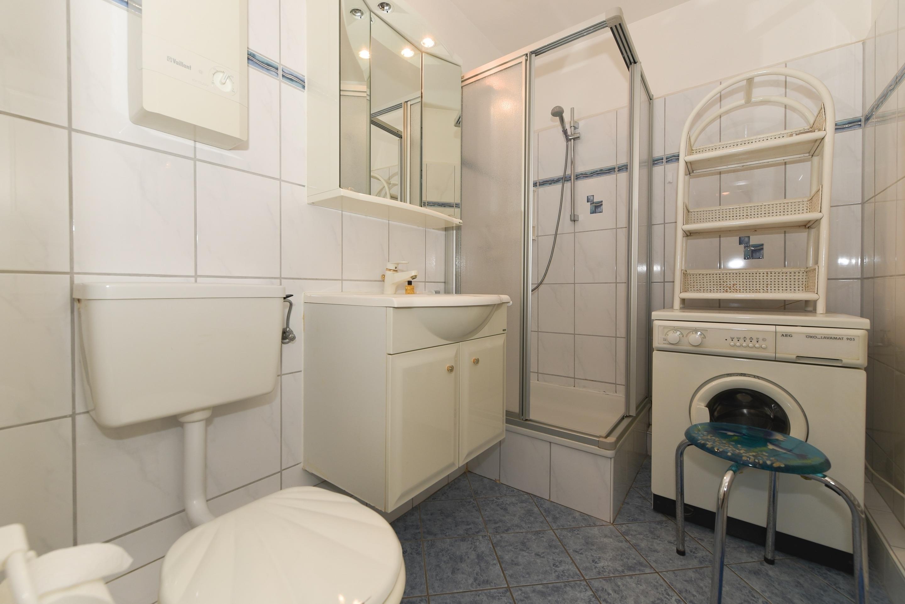 Das moderne Badezimmer ist mit einer Dusche und einer Waschmaschine ausgestattet – für zusätzlichen Komfort während Ihres Aufenthalts.