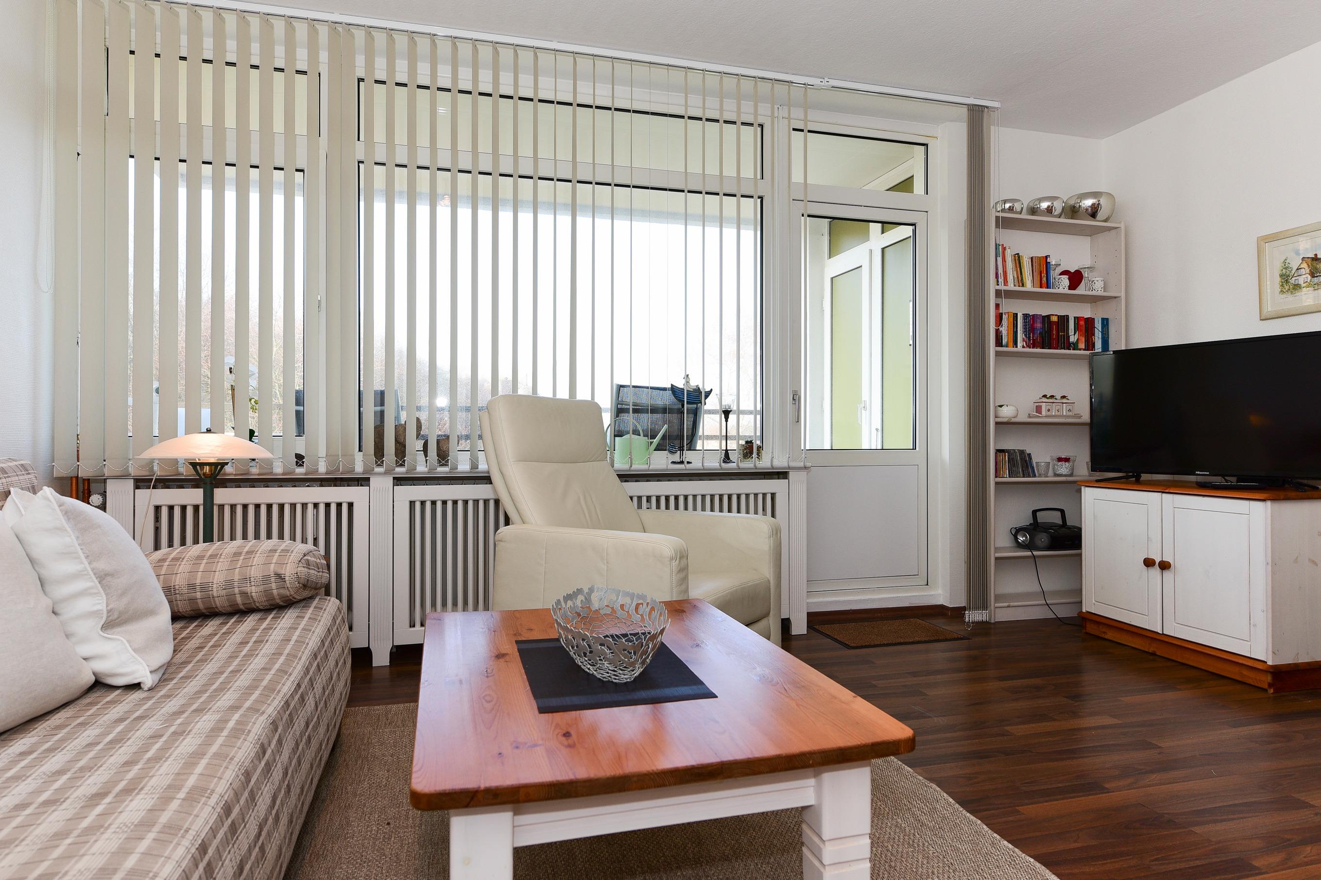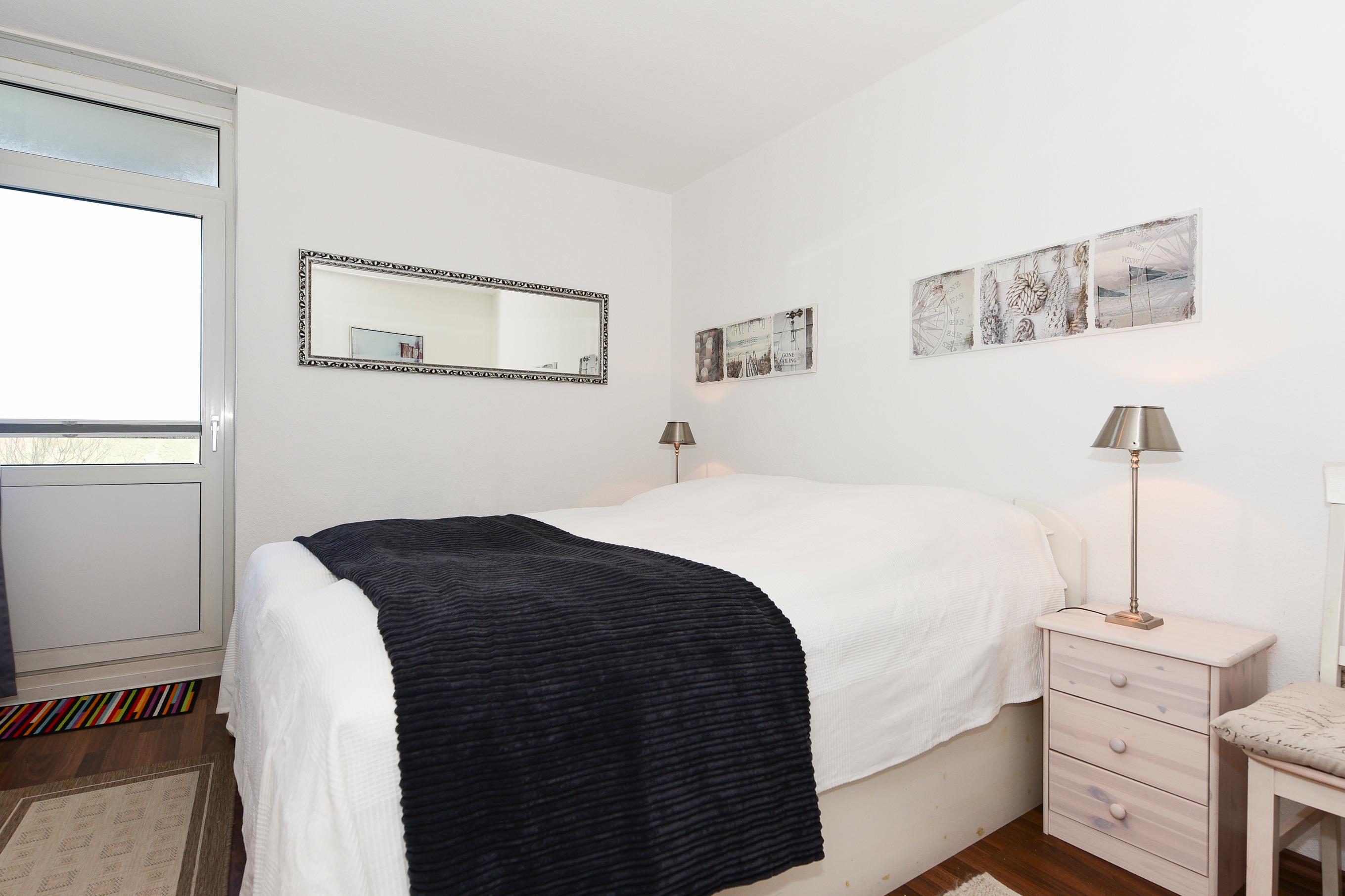 Die Wohnung befindet sich in ruhiger Lage, nur wenige Schritte vom Strand entfernt, und überzeugt durch helle Möbel und dunkles Laminat, die für eine gemütliche Atmosphäre sorgen. Im Wohnzimmer können Sie sich auf modernen Komfort freuen: Ein Flachbildschirm und ein DVD-Player sorgen für Unterhaltung, und das Sofa lässt sich mit wenigen Handgriffen in eine zusätzliche Schlafgelegenheit verwandeln. Der Essbereich für drei Personen fügt sich harmonisch in den Raum ein. Vom Wohnzimmer aus gelangen Sie direkt auf den Balkon, von dem aus Sie den Blick auf die Nordsee genießen können.
