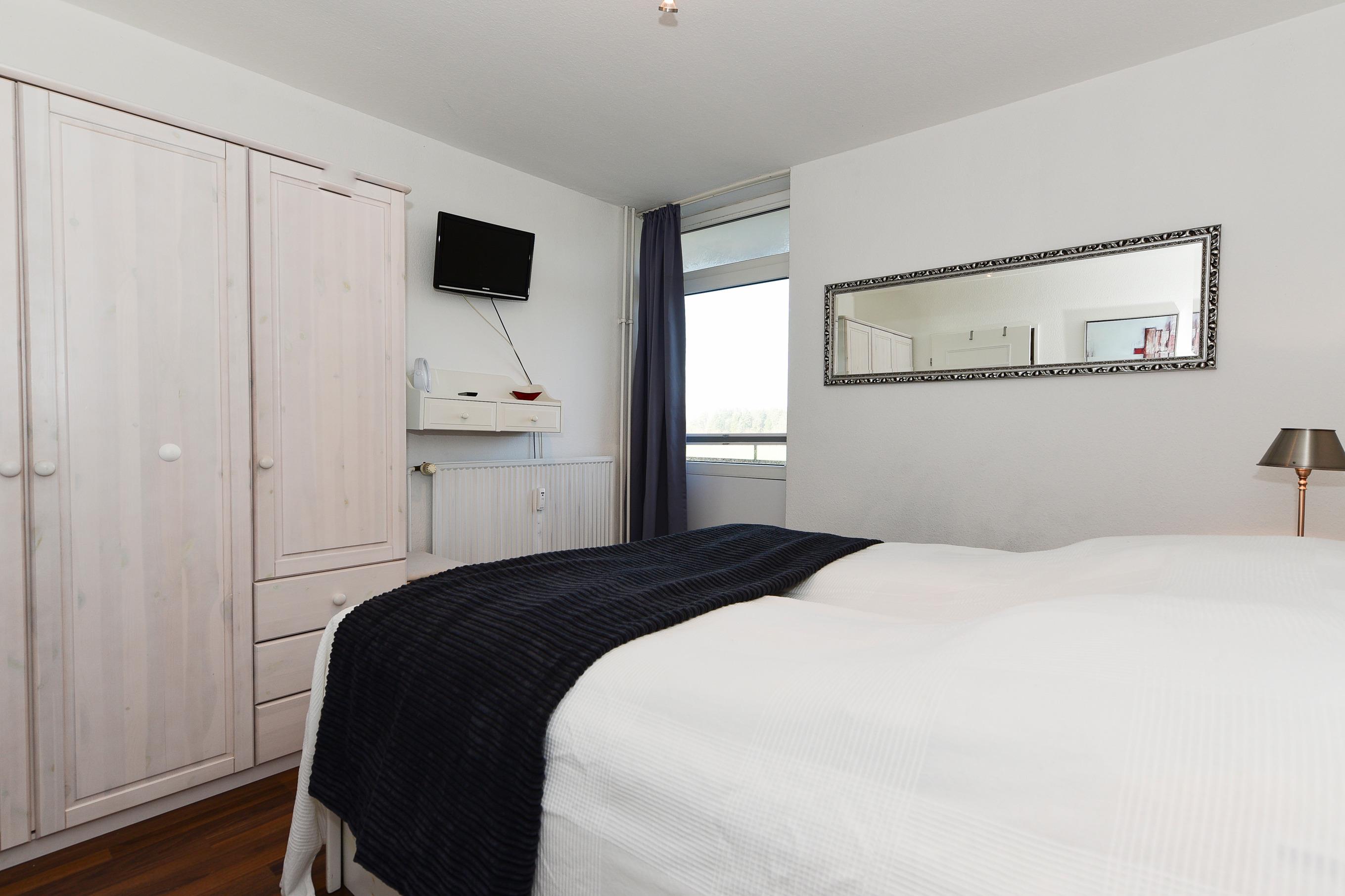 Das Schlafzimmer ist ein weiteres Highlight: Das gemütliche Doppelbett mit hohem Einstieg und elektrisch verstellbaren Lattenrosten sorgt für erholsamen Schlaf. Ein großer Kleiderschrank bietet Platz für Ihre Urlaubsgarderobe, und auch hier erwartet Sie ein zweiter Flachbildschirm. Vom Schlafzimmer aus haben Sie Zugang zu einem zweiten kleinen Balkon.