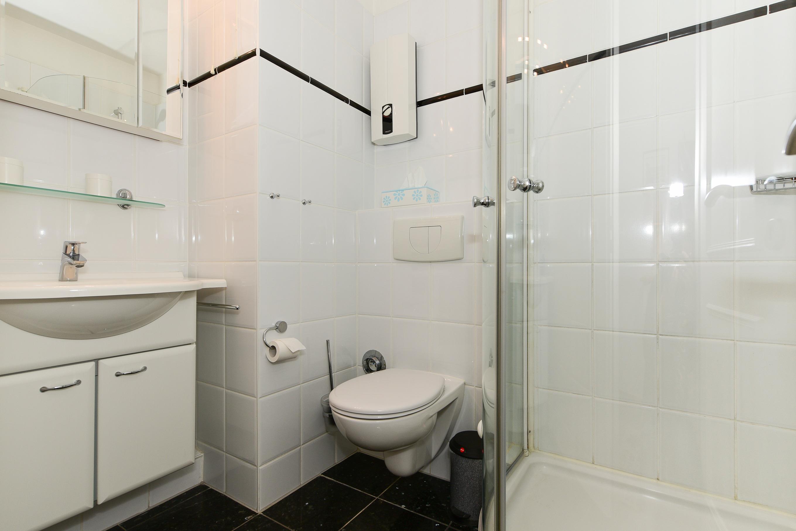 Das Badezimmer ist mit einer Dusche, einem WC und einem großen Spiegelschrank ausgestattet – hier können Sie sich bestens erfrischen.