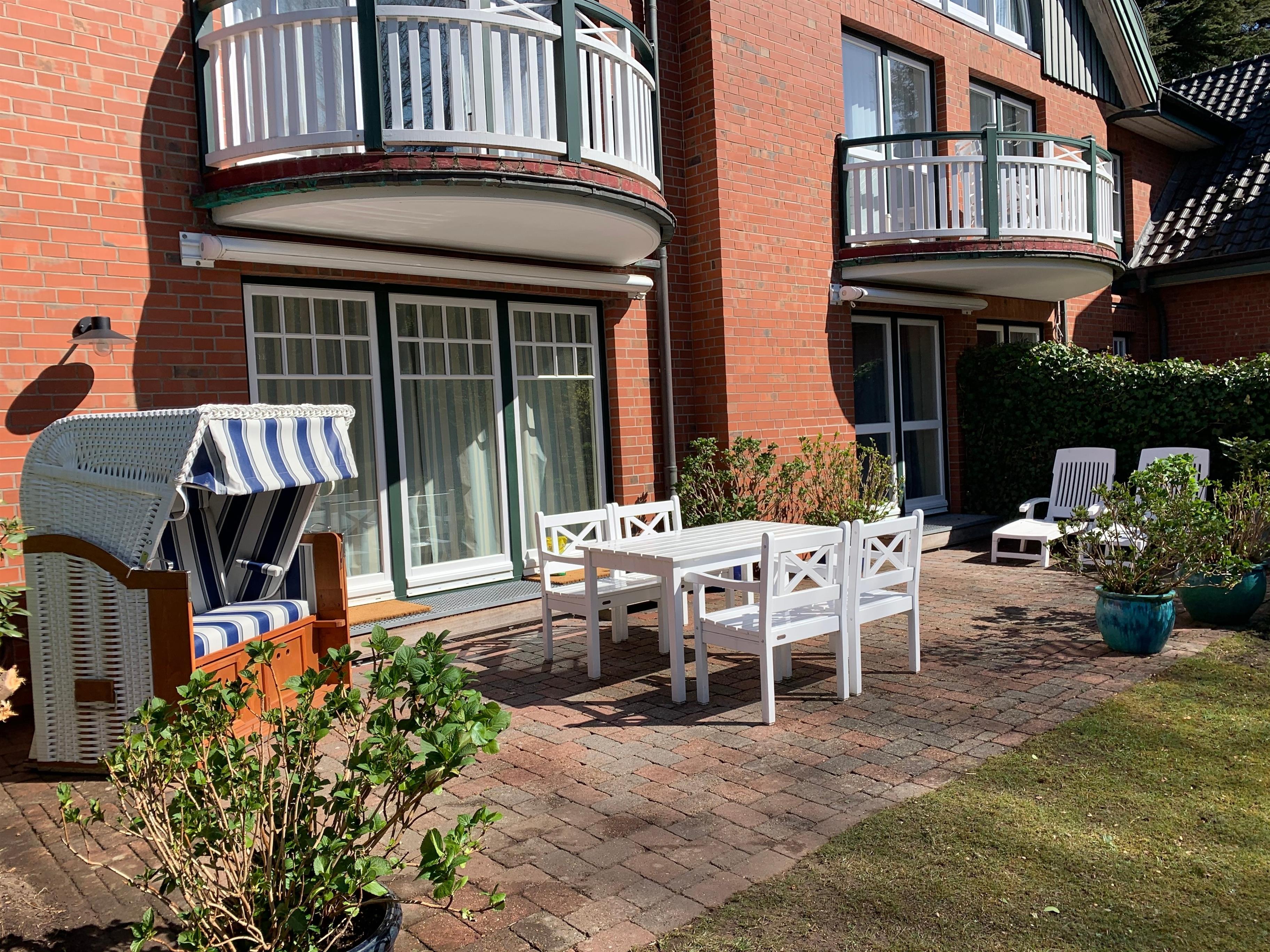 Dort erwarten Sie Gartenmöbel, eine Markise, ein Strandkorb und eine große Rasenfläche - ideal, um die Sonne und die frische Nordseeluft zu genießen.
