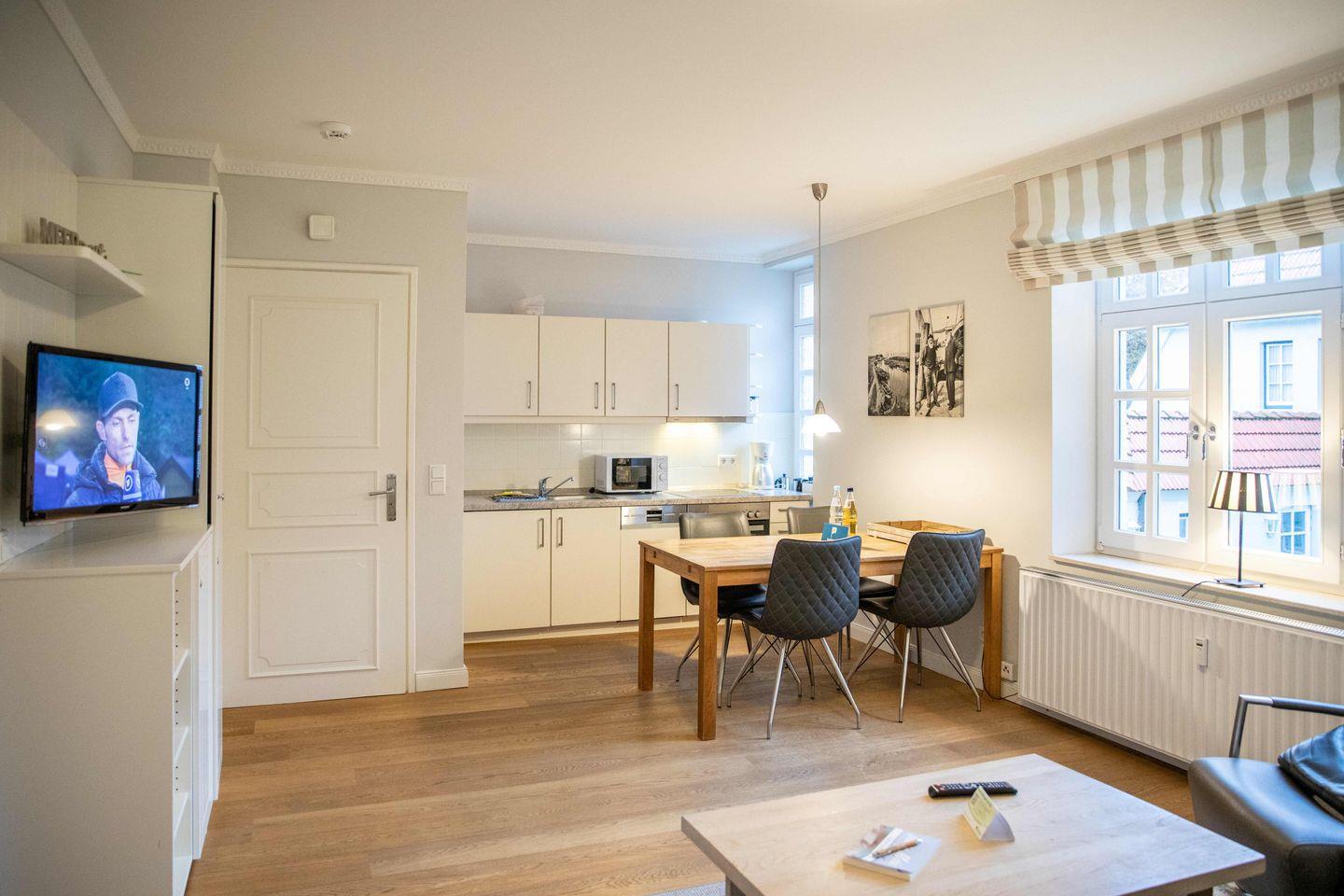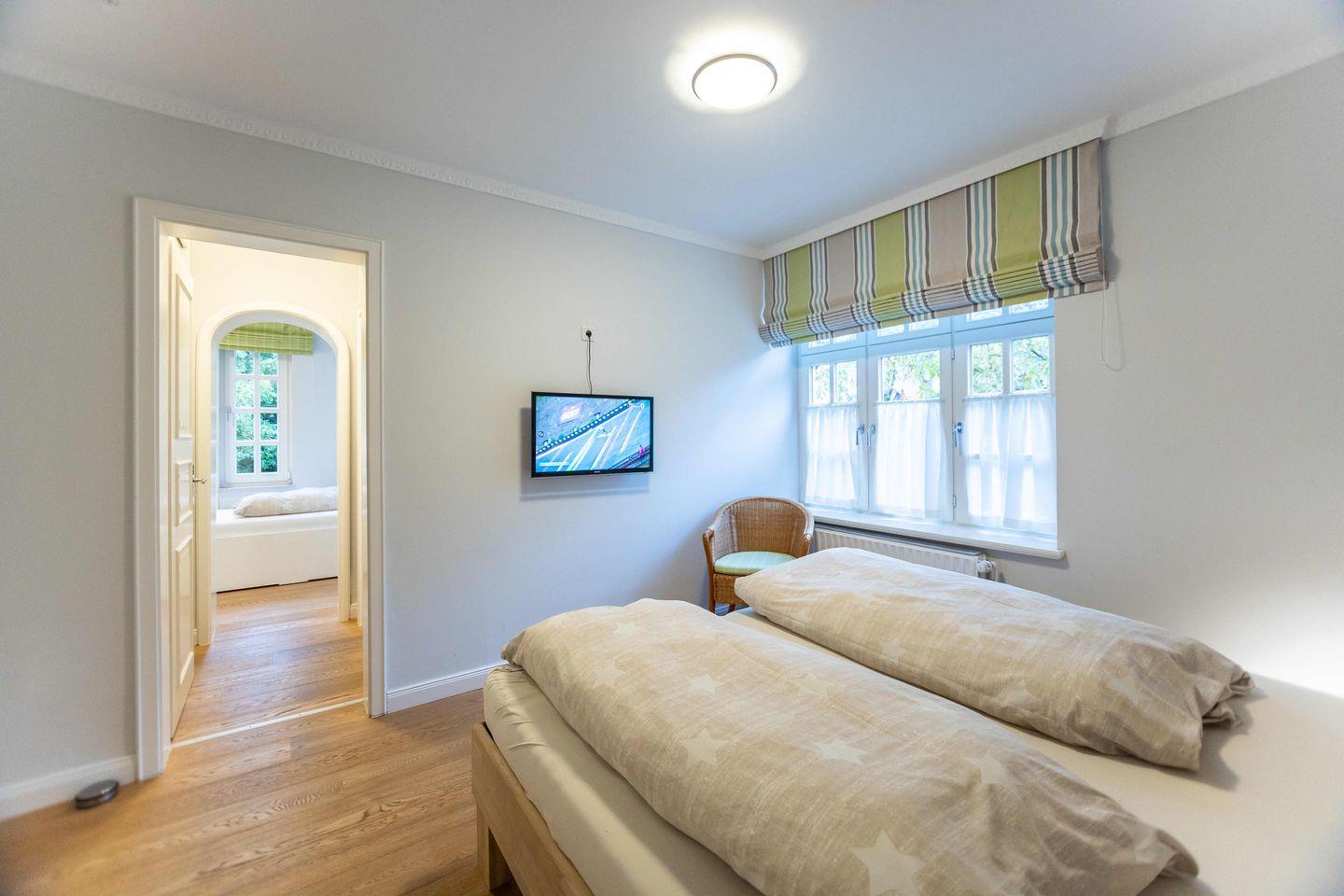 Moderne 3-Zimmer-Wohnung in der schönen Villa Friedericia, einer Jugendstilvilla auf einem ca.1200qm großen Grundstück. Das Objekt liegt im ruhigen Stadtbereich, und der Strand sowie die Promenade sind nur ein paar Meter entfernt. Hier finden Sie auf 54 qm Platz für bis zu 4 Personen. Ein Schlafzimmer mit Doppelbett, ein Schlafzimmer mit einem Einzelbett und einem Bett für Kinder bis zu 15 Jahren stehen für Sie bereit. Die Wohnung ist zusätzlich mit einer Küchenzeile und einem Essbereich ausgestattet. Die Küche ist mit einem Backofen, einer Geschirrspülmaschine und einer Mikrowelle versehen worden. Das Wohnzimmer verfügt über einen Flachbildfernseher und eine Stereoanlage.