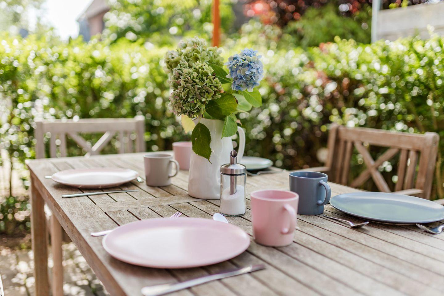 Im Erdgeschoss befinden sich der großzügige Wohn- und Essbereich mit separater Küche sowie ein Duschbad. Im Wohnbereich befindet sich ein Original Mylin-Kachelofen, der auch an kühleren Tagen angenehme Wärme spendet. Zudem gelangen Sie über den Wohnbereich direkt auf die eigene Terrasse und in den Garten. Die Küchenausstattung ist vielfältig, zusätzlich zur Filter-Kaffeemaschine wurde noch eine Nespresso-Kapselmaschine angeschafft - auch eine Waschmaschine und ein Trockner stehen Ihnen zur Verfügung. Das Ferienzuhause zeichnet sich durch hochwertige Einbauschränke und Betten einer hiesigen Tischlerei aus.