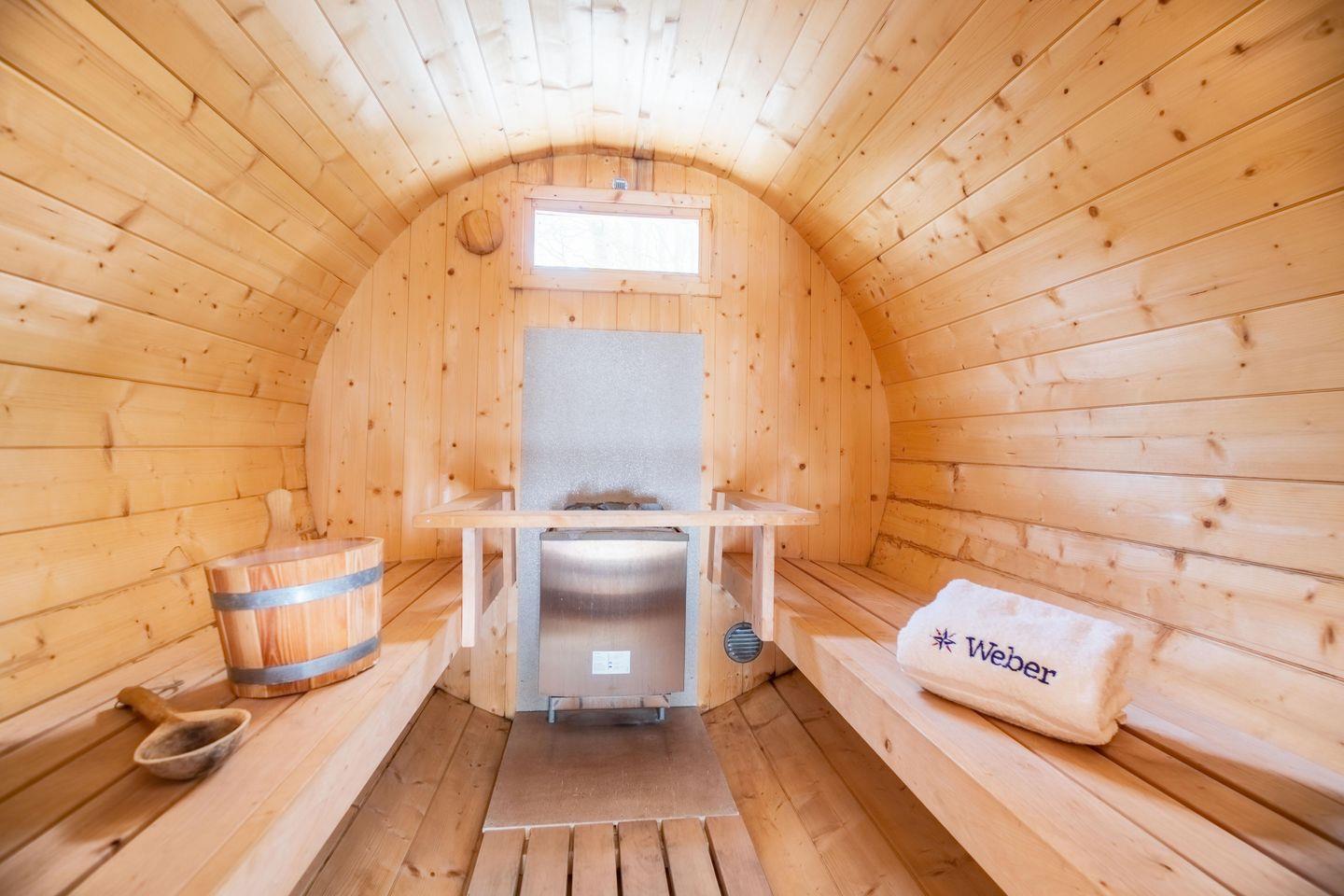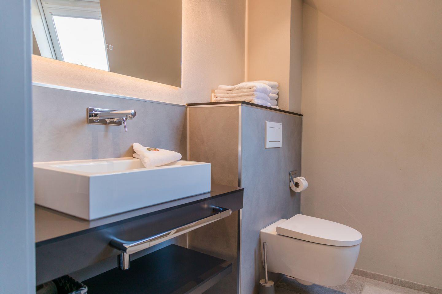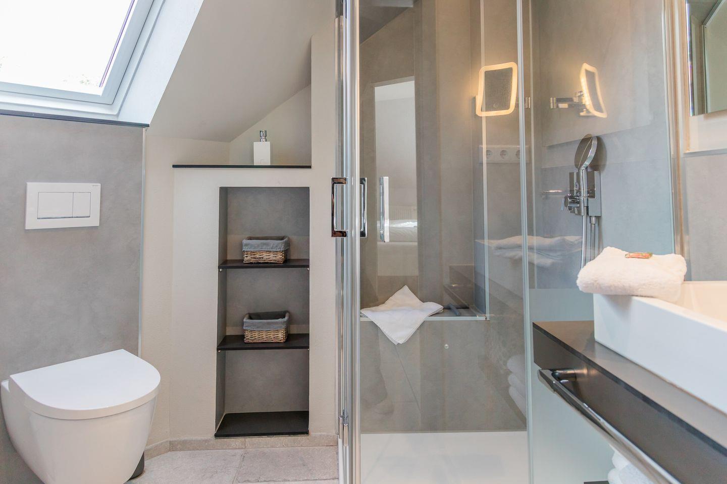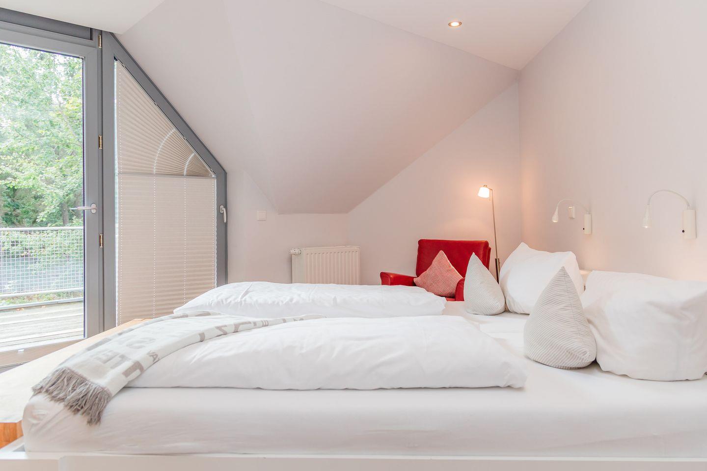 Im Obergeschoss befinden sich die 3 Schlafzimmer sowie 2 weitere Duschbäder. Alle Schlafzimmer sind mit einem Doppelbett ausgestattet, das dritte verfügt zudem über ein zusätzliches Einzelbett. Das Master-Schlafzimmer verfügt über einen eigenen Balkon mit Blick auf den Garten und den angrenzenden Wald.