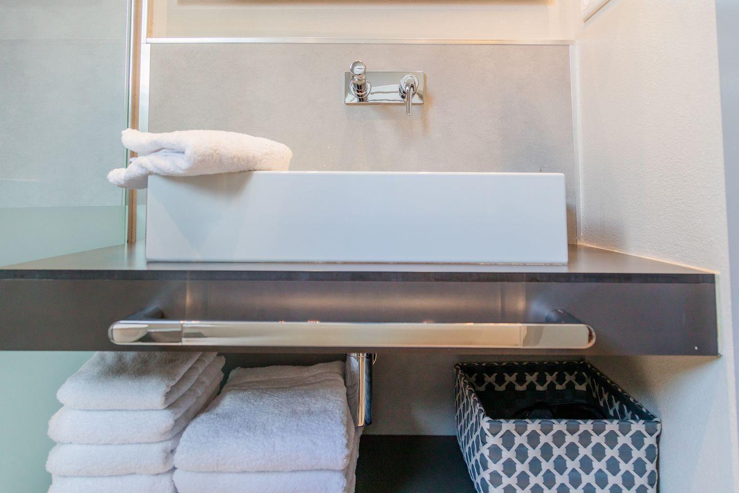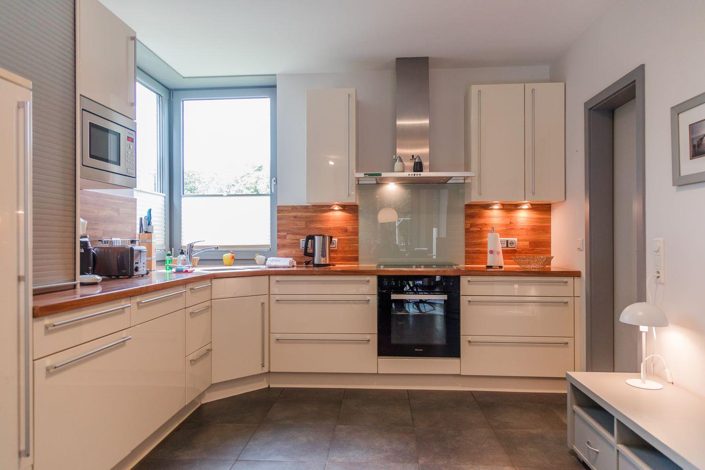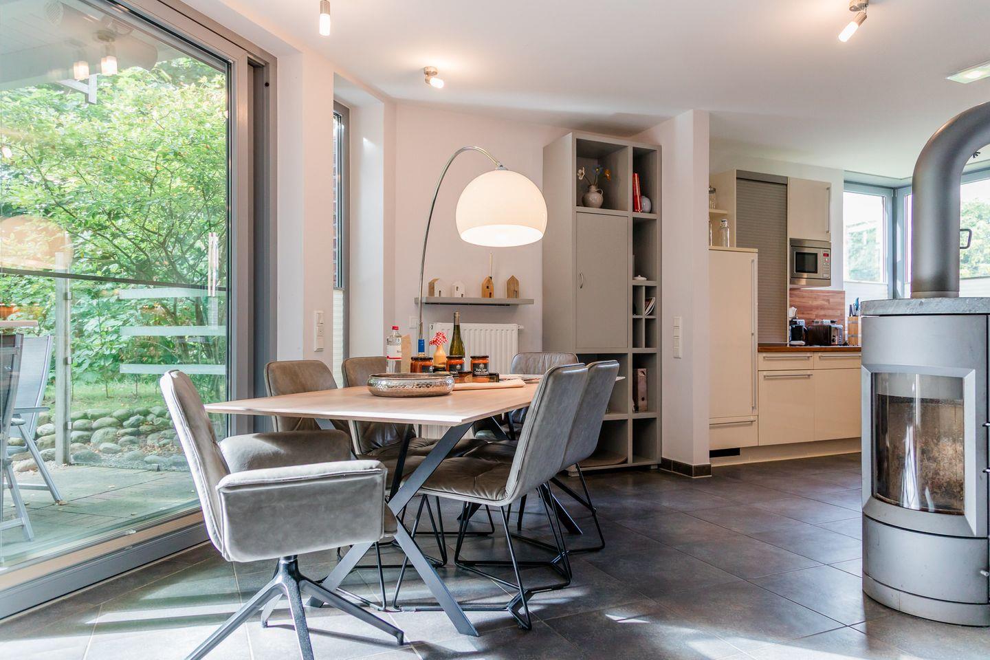 Im Erdgeschoss befinden sich der großzügige Wohn-Essbereich mit offener Küche und ein Duschbad, sowie ein Hauswirtschaftsraum mit Waschmaschine und Trockner. Vom Essbereich aus haben Sie direkten Zugang auf die überdachte Terrasse und in den Garten. Hier befindet sich auch der Kaminofen, welcher an kühleren Tagen für wohlige Wärme sorgt. Auch eine JBL-Musikbox finden Sie im Haus vor. Die Küche ist mit hochwertigen Geräten ausgestattet, u. A. mit einer Nespresso-Kapselmaschine.