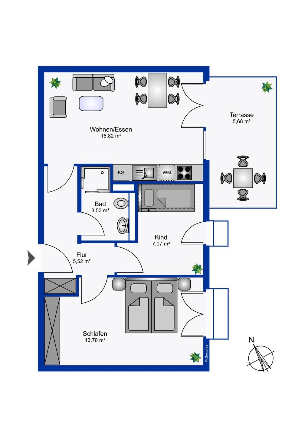 Vom Wohn-Ess-Küchenbereich aus haben Sie direkten Zugang zu Ihrer Terrasse, die nach Osten hin ausgerichtet ist. Hier können Sie den Tag mit einem gemütlichen Frühstück in der Sonne beginnen oder den Abend mit einem Glas Wein ausklingen lassen.
