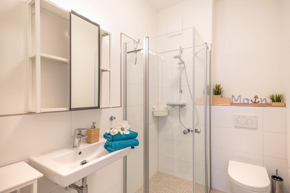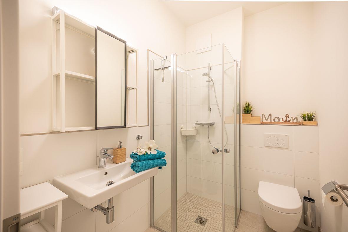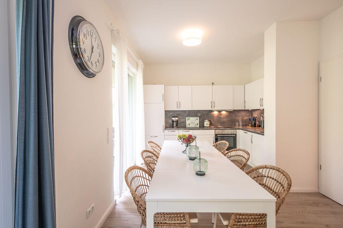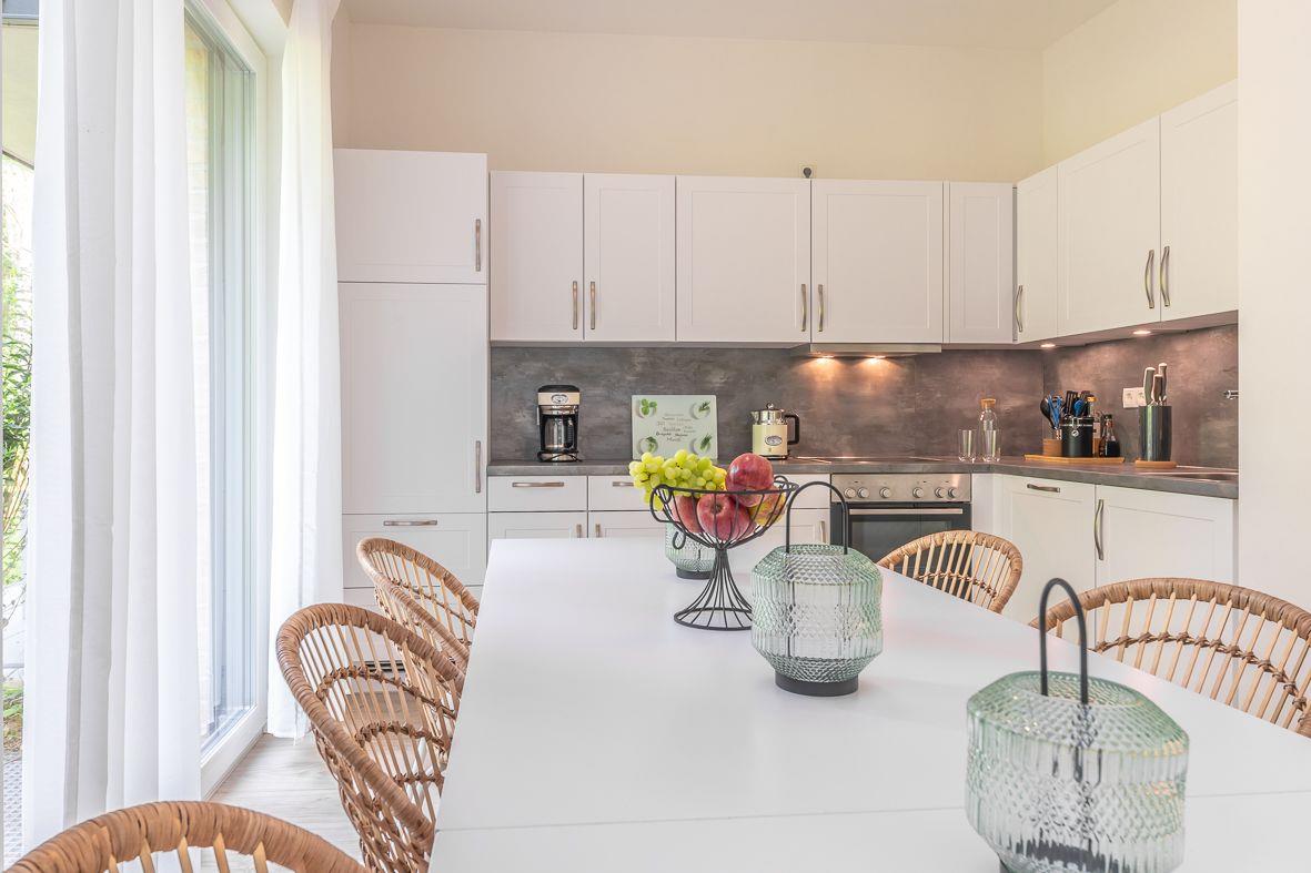 Über den Eingang im westlich gelegenen Neubau gelangen Sie in die Wohnung. Im Erdgeschoss finden Sie ein zusätzliches Duschbad, eine moderne, offene Küche mit Ceranfeld, Backofen und Kaffeemaschine sowie den angrenzenden Wohn- und Essbereich. Hier wurde der skandinavische Stil mit der Modernen harmonisch vereint. Selbstverständlich sind ein Flachbildfernseher und ein Internetzugang vorhanden. Im Gästezimmer können Sie zusätzlich fernsehen.