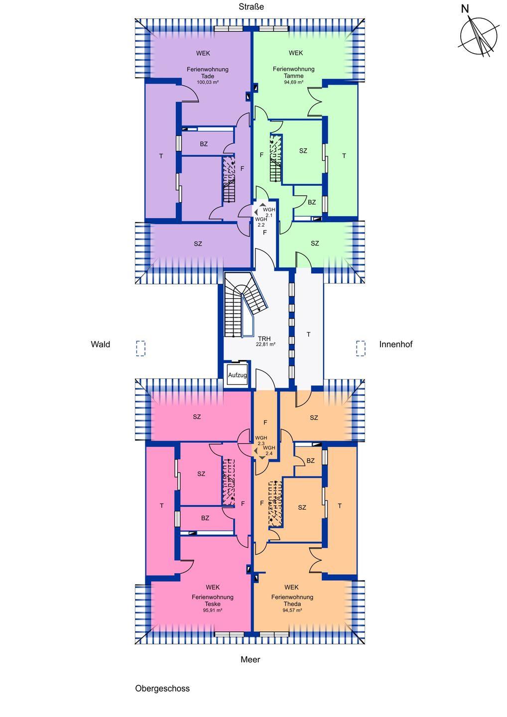 Die Ferienwohnung Tade im Dachgeschoss des Geländes am Golfplatz 9b in Wyk auf Föhr bietet Ihnen auf 91m², aufgeteilt auf zwei Ebenen, Platz für bis zu 8 Personen (6 Personen und 2 Babys). Über den Eingang im westlich gelegenen Neubau gelangen Sie in die liebevoll eingerichtete Wohnung, die mit einer modernen Küche mit Ceranfeld, Backofen und Kaffeemaschine gut ausgestattet ist und an den Wohn- und Essbereich angrenzt. Natürlich darf der Flachbildfernseher und der Internetzugang nicht fehlen.