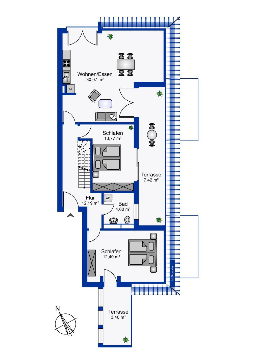 Die Wohnung verfügt zudem über einen eigenen Waschtrockner, damit Sie auch während Ihres Urlaubs Ihre Wäsche bei Bedarf waschen können. Über das Grundstück und einen kurzen Weg haben Sie einen barrierefreien Zugang zum 350 m entfernten Strand, einen kurzen Weg zu rasanten Abenteuern auf der Föhrer Kartbahn "Föhrring" und zum Föhrer Flugplatz. Für einen Spaziergang im Wald müssen Sie nur die Straße überqueren. Der Spielplatz "Piratennest" wartet dort bereits auf unsere jüngeren Gäste.