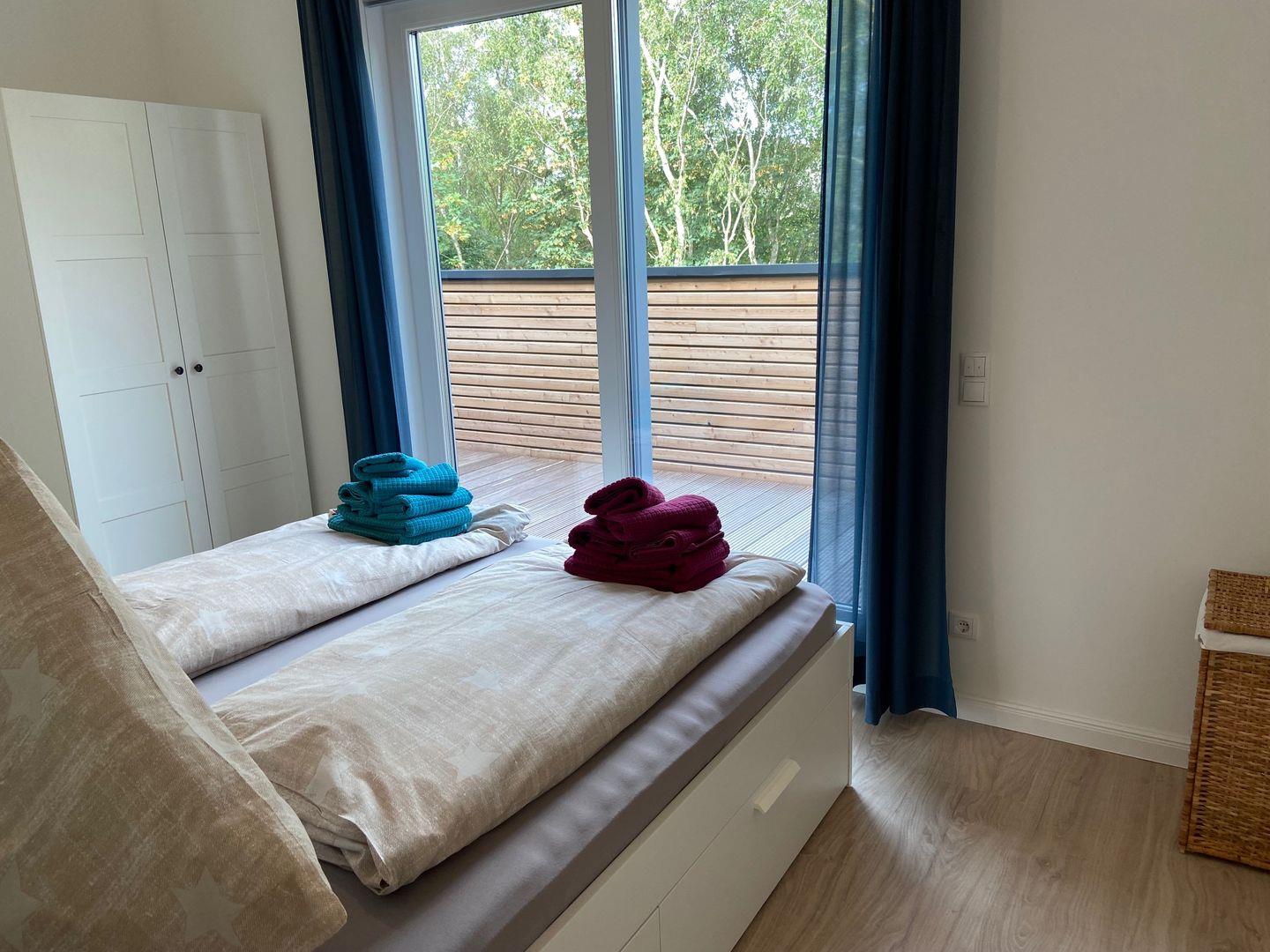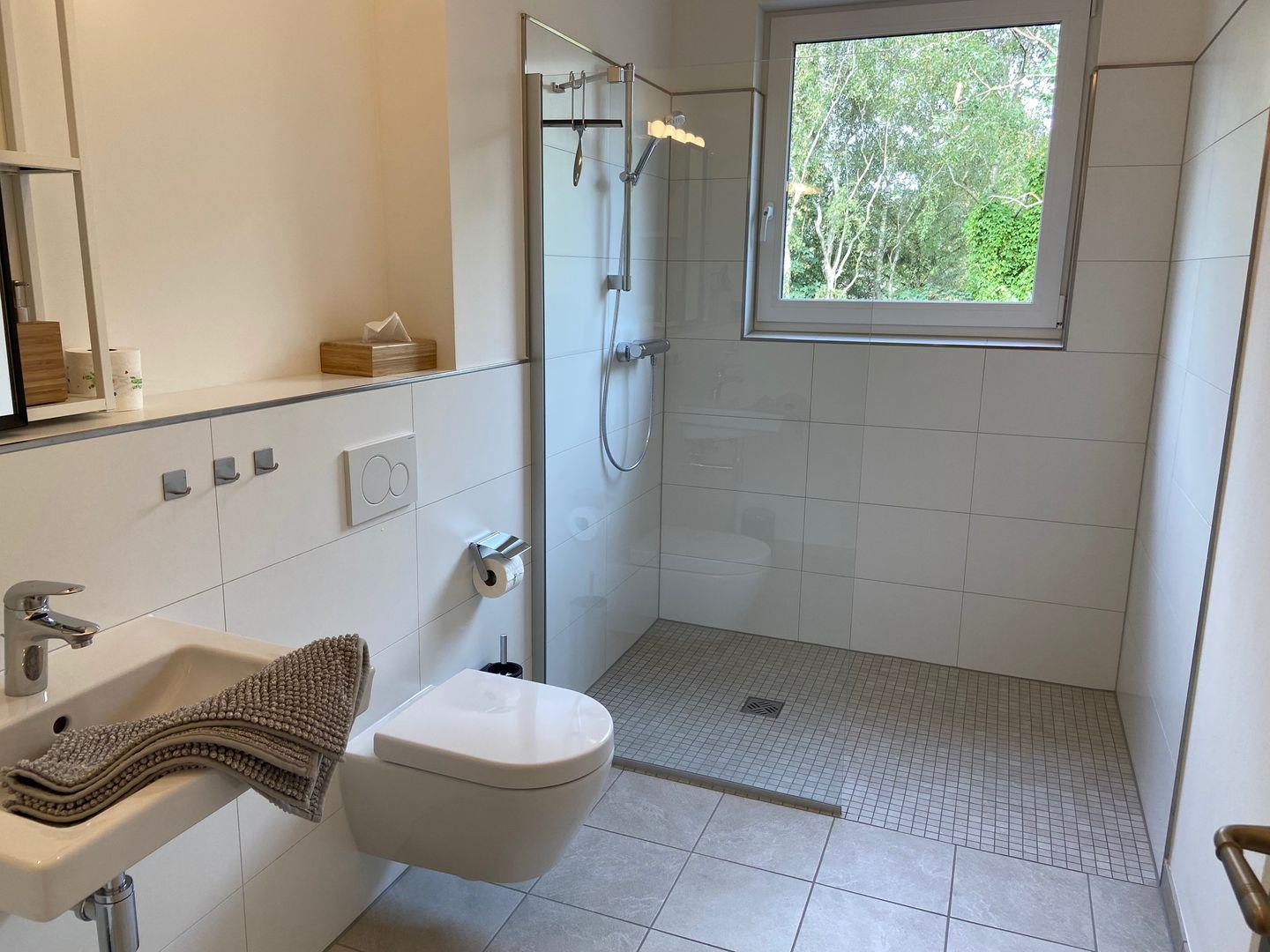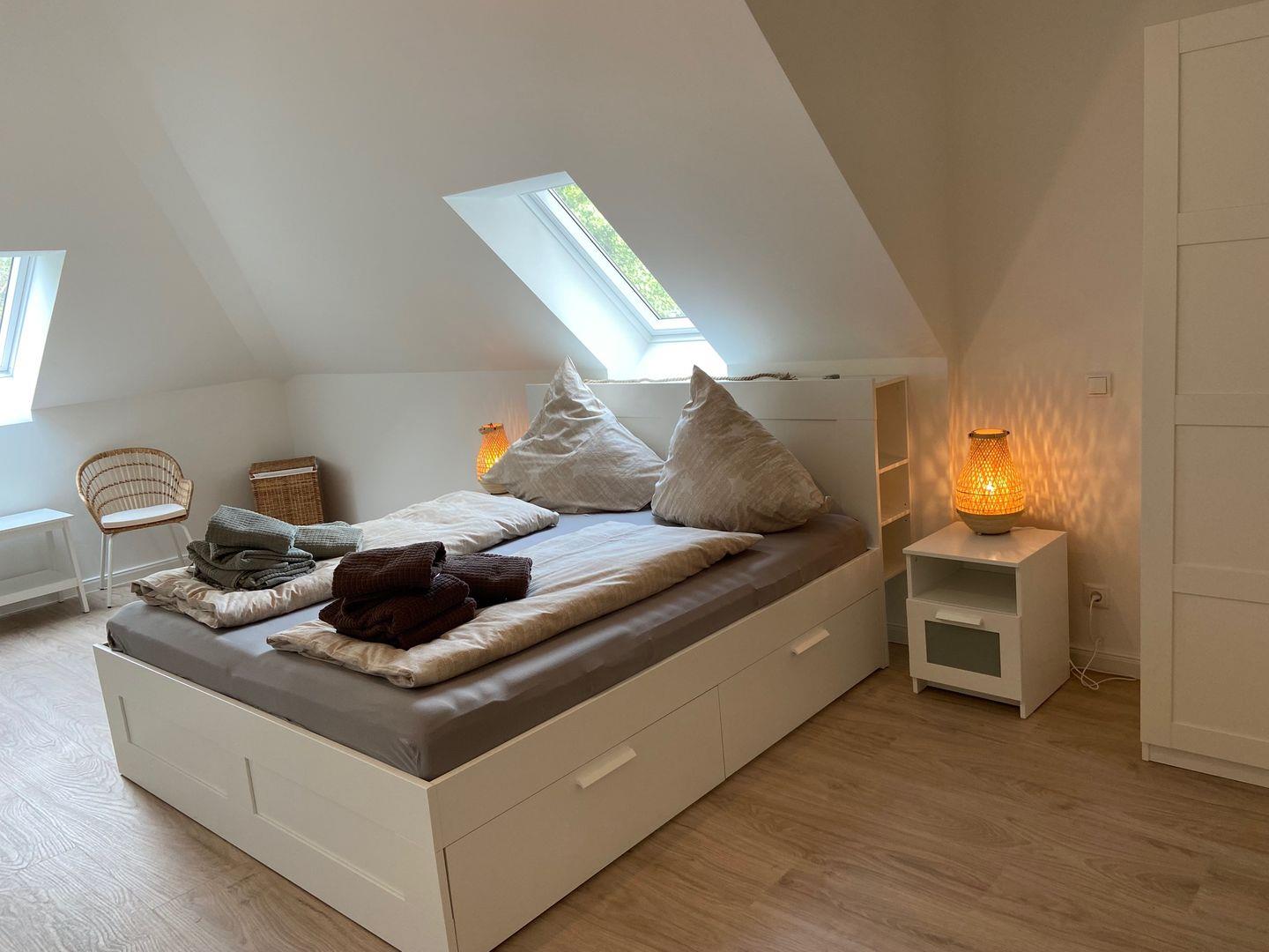 Das Highlight der Ferienwohnung Teske ist zweifellos das zweite Badezimmer, das sich im Dachgeschoss befindet und mit einer Badewanne ausgestattet ist. Die beiden Schlafzimmer mit je einem Doppelbett (180*200) sind ebenfalls im 2. Obergeschoss, auf der Hauptebene, untergebracht. Das Duschbad ist hell gestaltet und verfügt über eine ebenerdige Dusche.