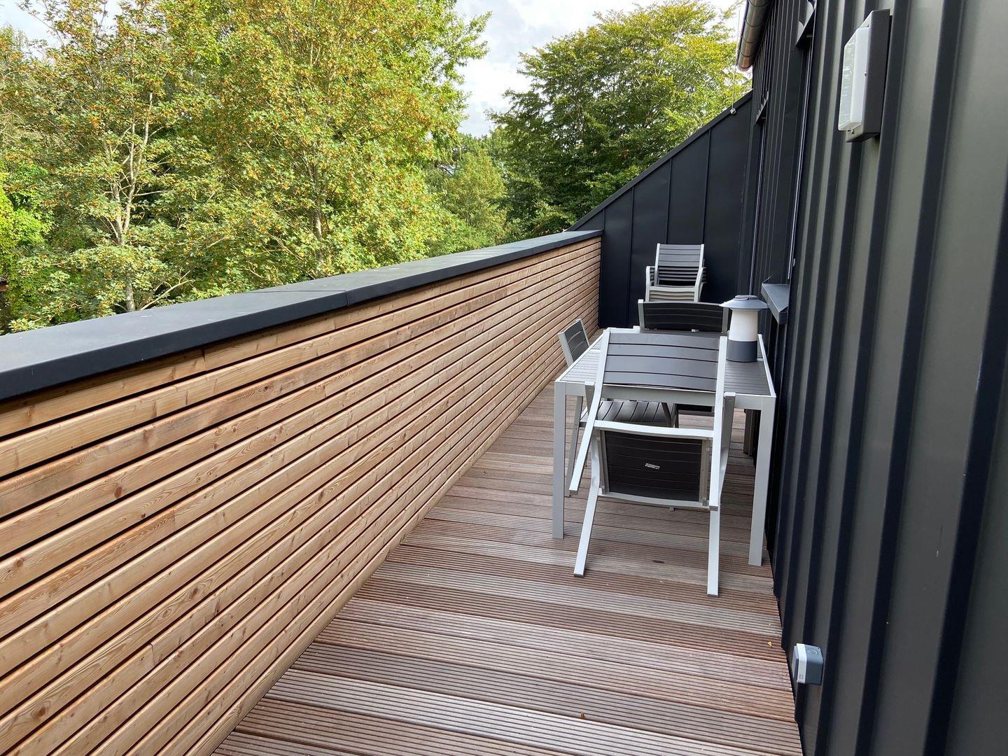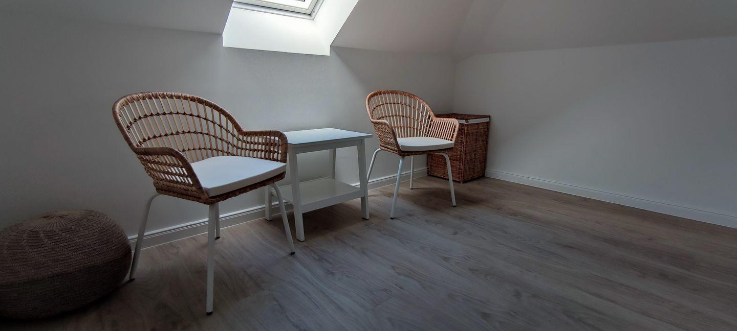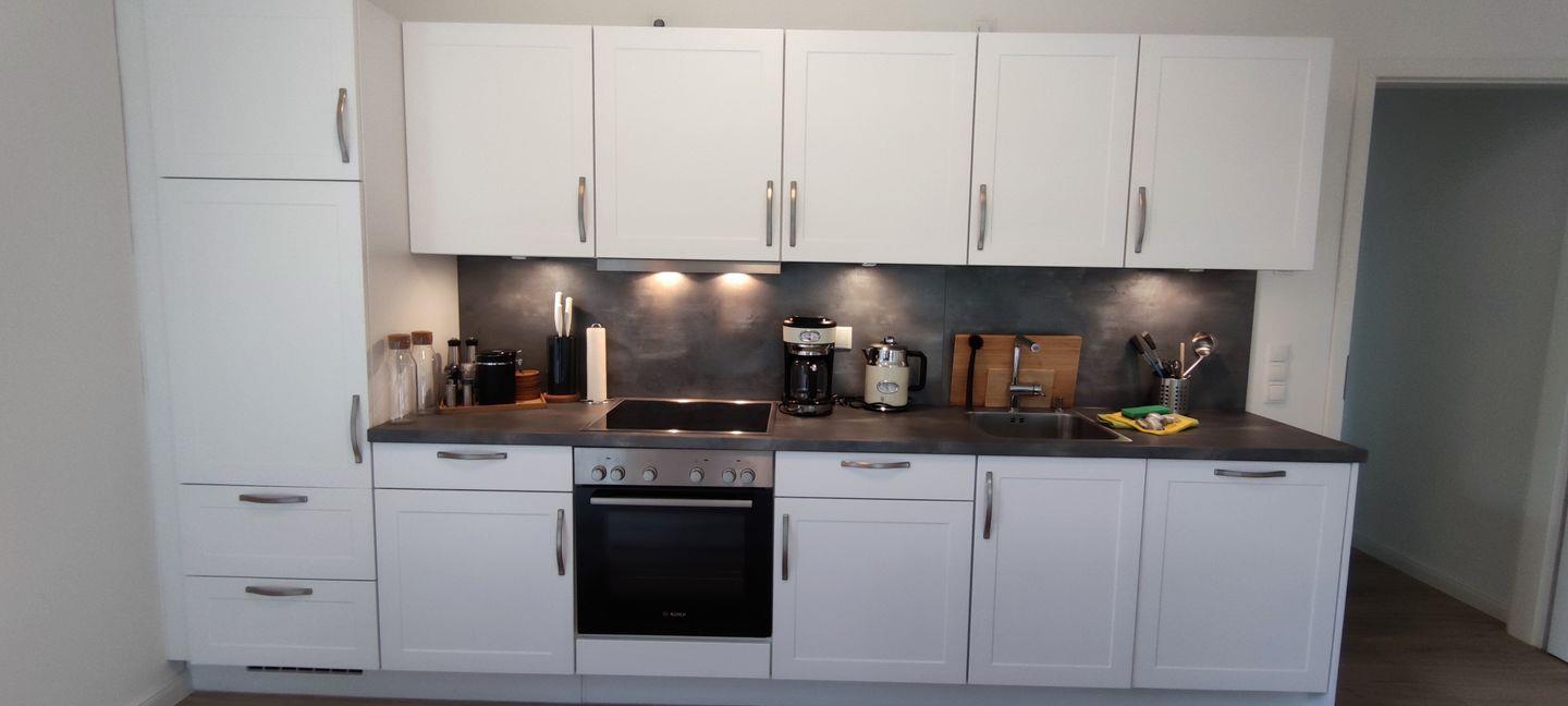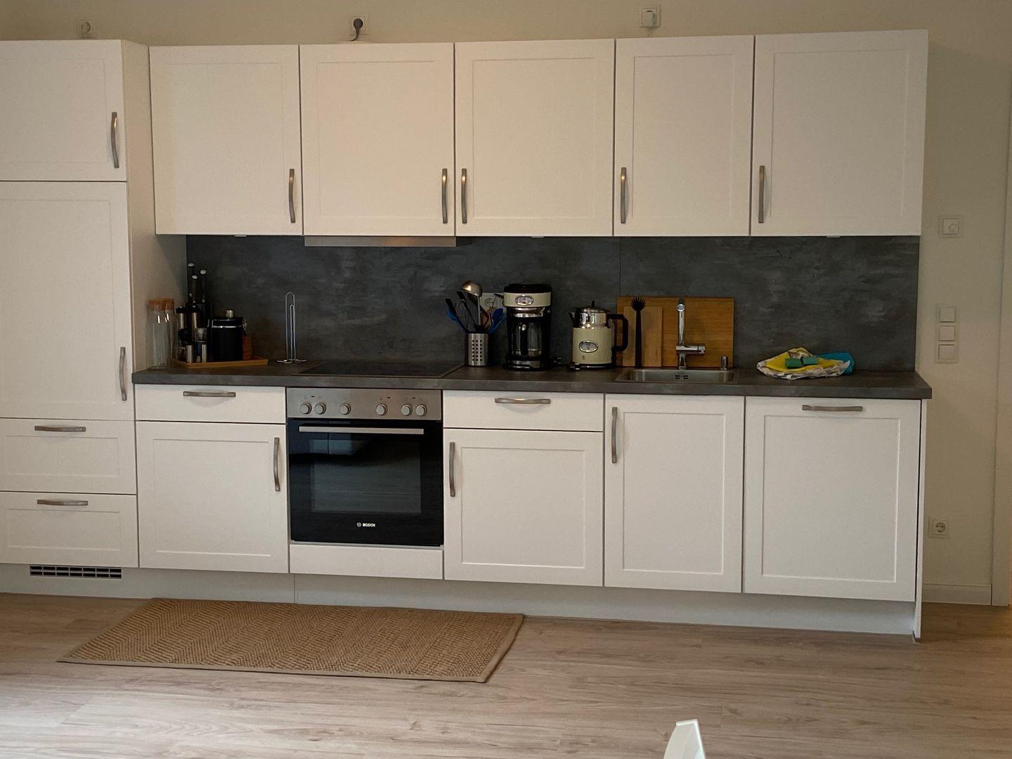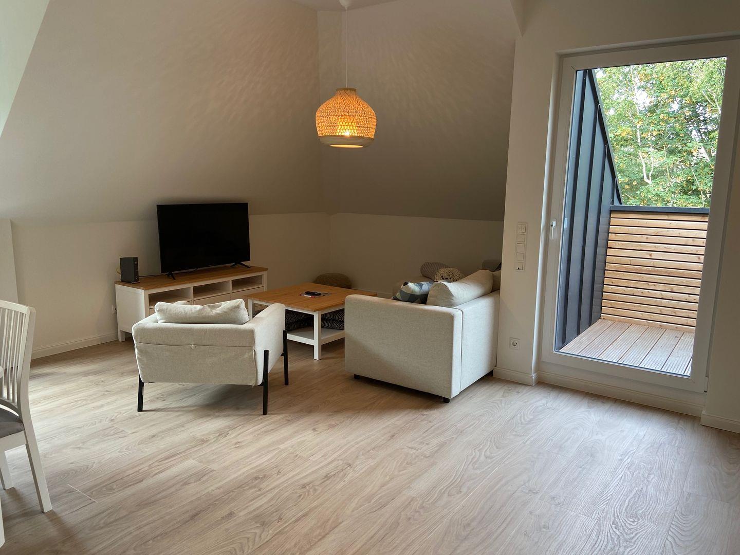 Der Eingang zur Wohnung befindet sich im westlich gelegenen Neubau. Hier betreten Sie eine moderne, gut ausgestattete Küche mit Ceranfeld, Backofen und Kaffeemaschine. An den Essbereich schließt sich der Wohnbereich an, der mit einem Flachbildfernseher und Internetzugang ausgestattet ist. Der skandinavische Stil zieht sich durch die gesamte Wohnung und verleiht ihr ein besonderes Flair.