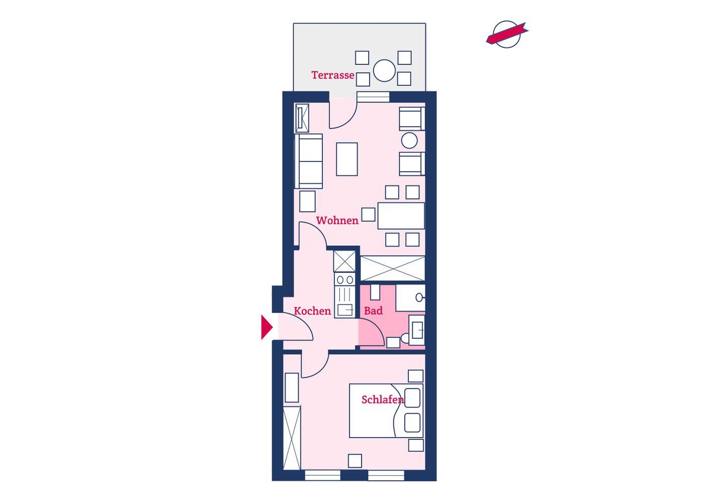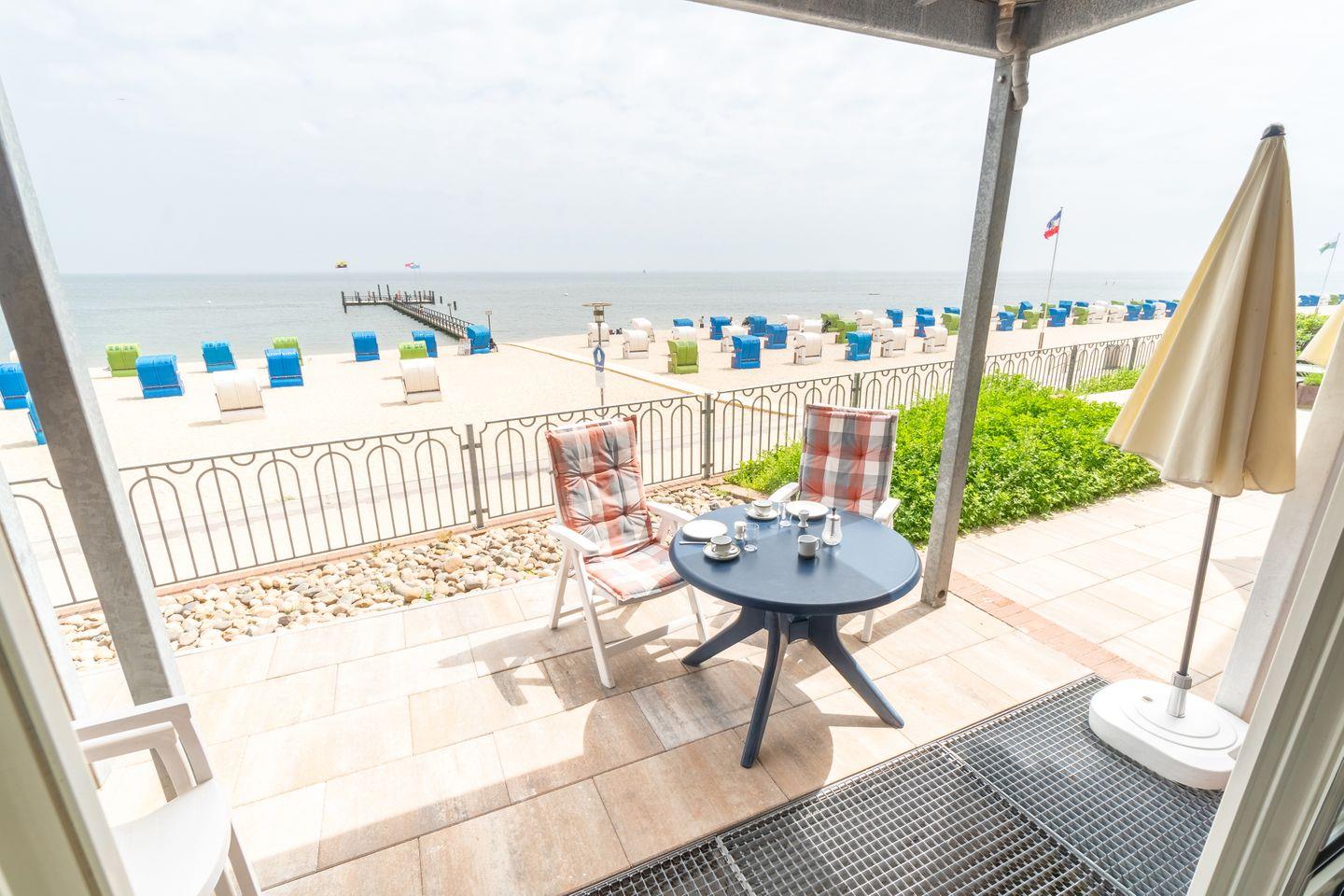 Die 2-Zimmer-Wohnung Fünen befindet sich im Erdgeschoss mit einer besonders guten Aussicht auf den Strand und das Meer. Einmalig ist der weite Blick aus dem südöstlich zum Meer ausgerichteten, bodentiefen Fenstern im Wohnzimmer. Genießen Sie schöne Stunden auch auf der Terrasse vor dem Wohnzimmer unmittelbar an der Strandpromenade oder das rauschende Meer bei offenen Fenstern. Die Ferienwohnung Fünen verfügt zudem über eine separate Küche, ein Schlafzimmer mit Doppelbett und ein Duschbad. Im Wohnbereich befindet sich eine Schlafcouch für 2 Personen.