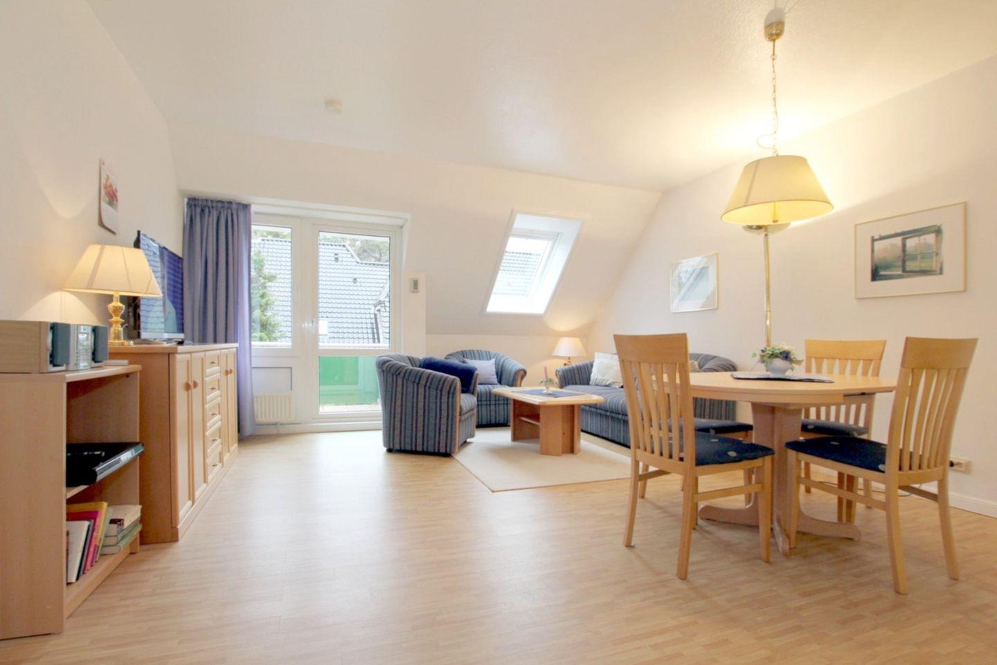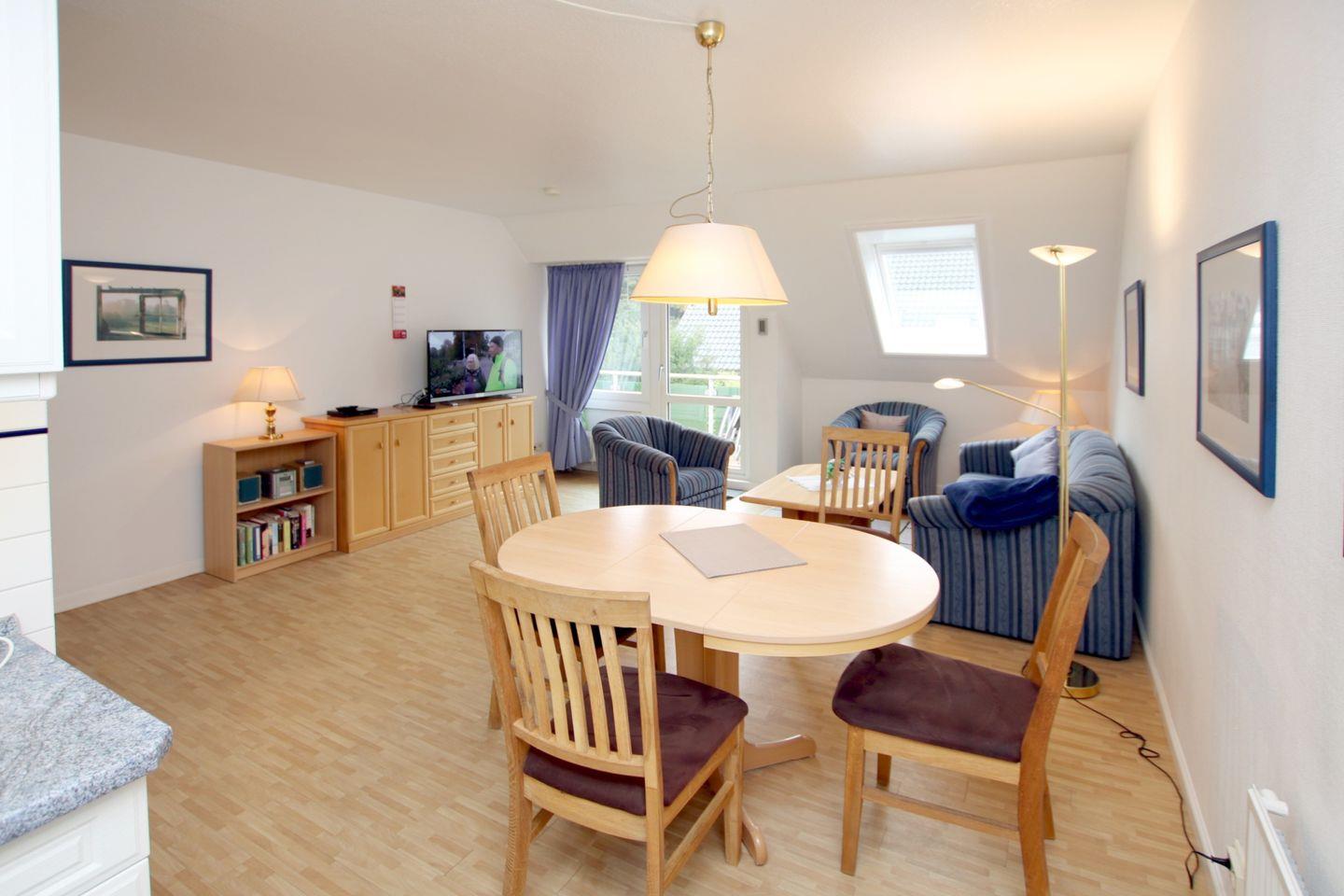 - Wohnzimmer mit Couch, 2 Sesseln, Esstisch mit 4 Stühlen, TV