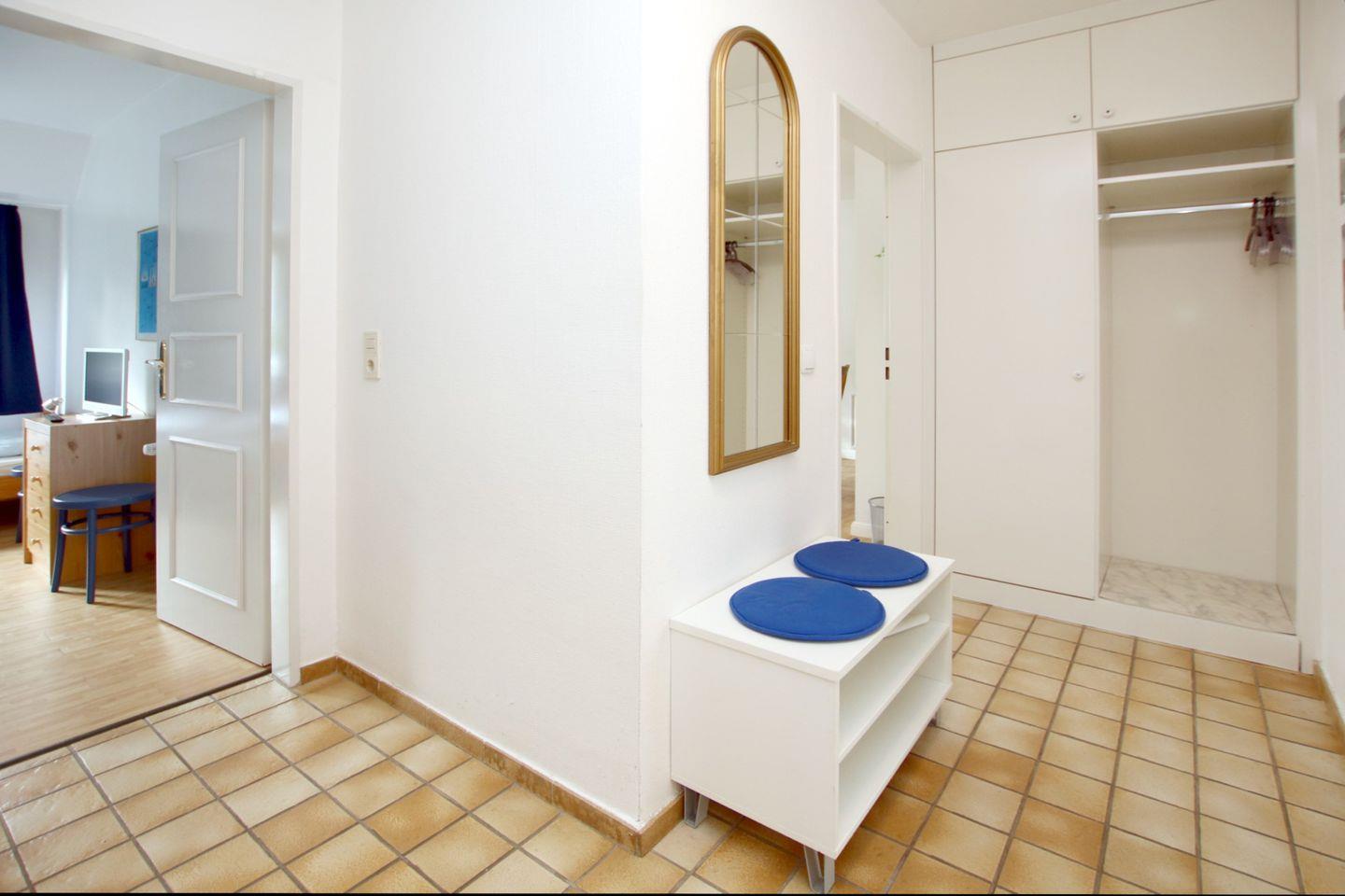SCHLAFZIMMER 2 mit zwei Einzelbetten. BAD mit Dusche, WC und Bidet. FLUR mit Garderobe und Schrank. Abstellkammer. Internetanschluss Wlan. Im KELLER stehen Waschmaschine und Trockner zur Verfügung. Großer Saunabereich mit Dusche, WC und 2 Ruheliegen. Einkaufsmöglichkeiten in der Nähe. In die Innenstadt sind es ca. 20 Minuten Fußweg auf der Promenade am Meer entlang, zum Strand ca. 2 Minuten Fußweg durch den Kurpark. Sehr gepflegte Wohnung in ruhiger und strandnaher Lage.