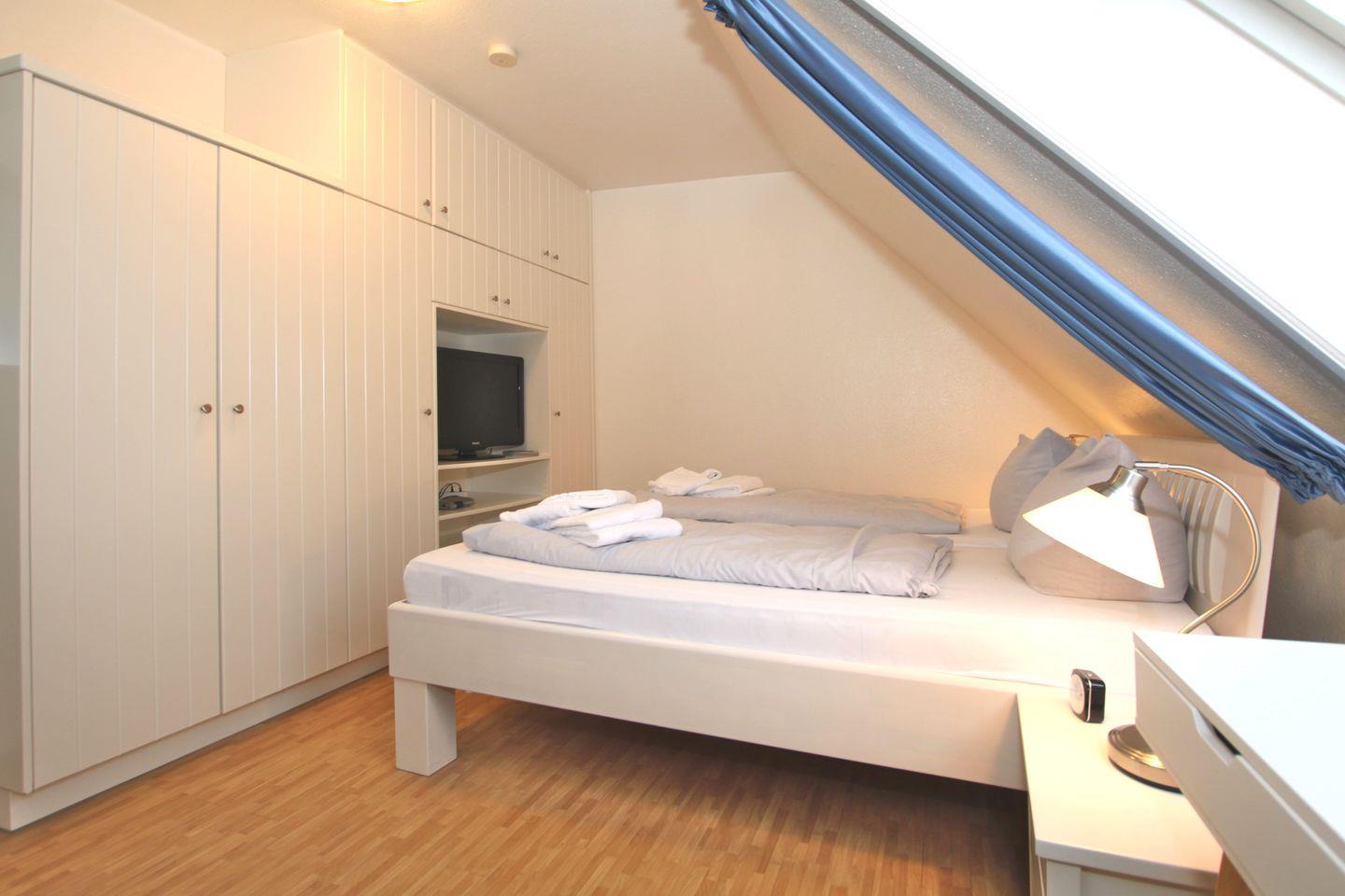- Schlafzimmer 1 mit Doppelbett, Kleiderschrank, Schreibtisch und TV