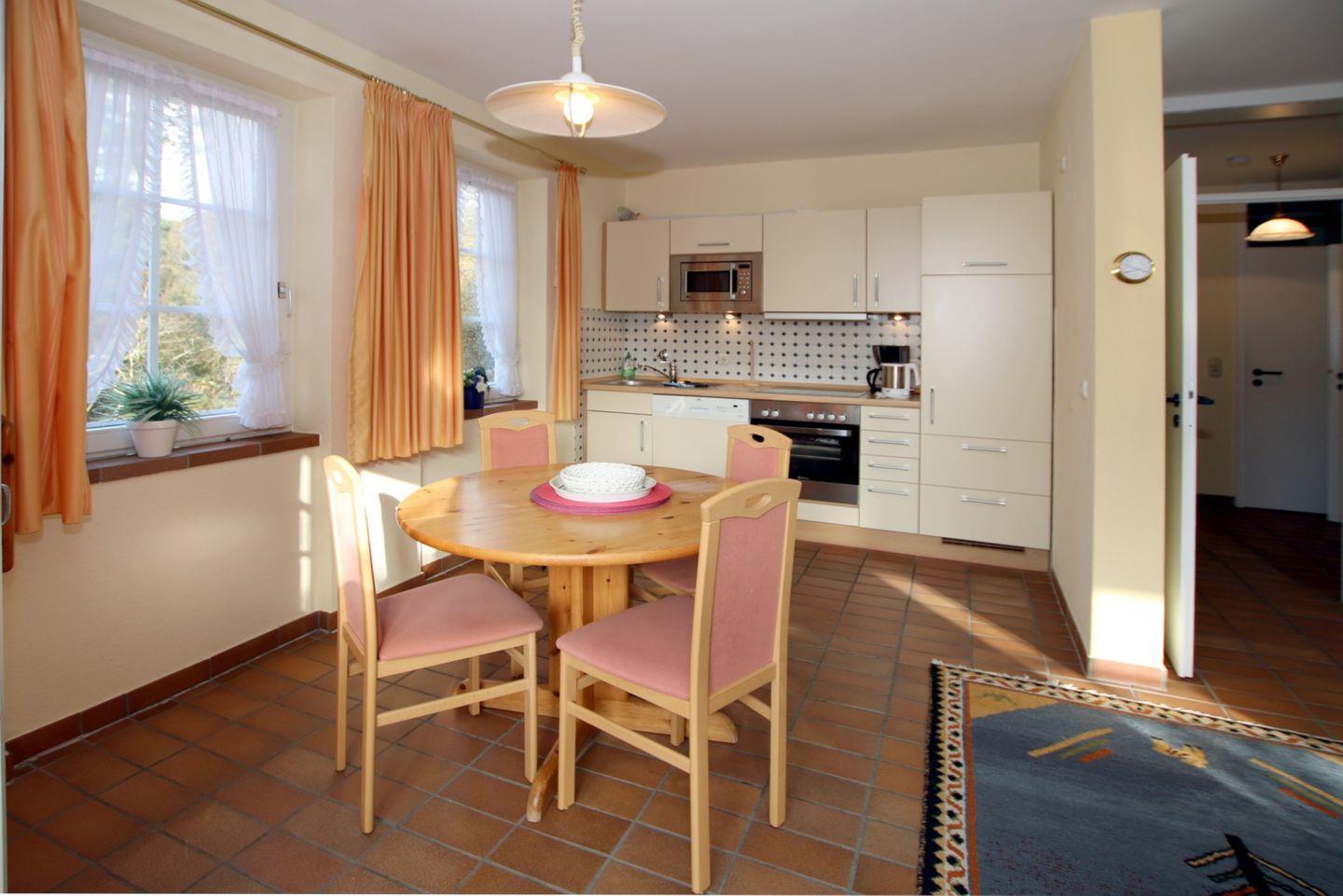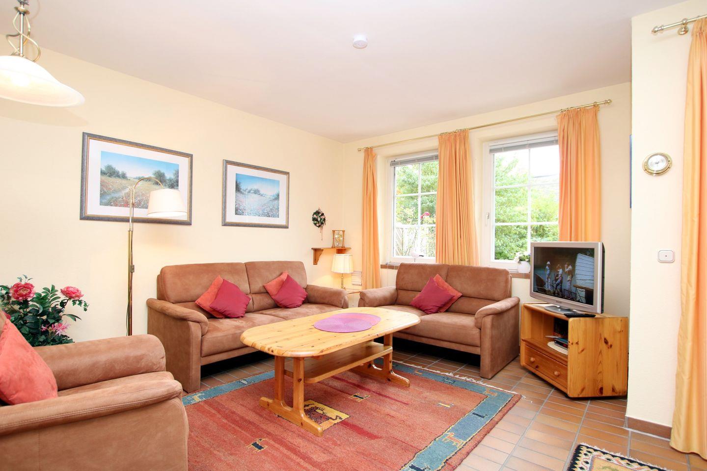 2-Zimmer-Nichtraucherwohnung im Erdgeschoß mit Südterrasse. WOHNZIMMER: Große Couch über Eck und 1 Sessel, Esstisch mit 4 Stühlen und KÜCHENZEILE mit Vollausstattung. SCHLAFZIMMER mit Doppelbett (1,60 x 2 m) und Kleiderschrank. BAD mit Dusche und WC. Fahrradständer und Parkplatz am Haus. Zum Strand sind es nur wenige Meter, zum Zentrum, Kurmittelhaus u. Wellenbad ca. 15 - 20 Minuten Fußweg. Die Wohnung ist liebevoll und gepflegt eingerichtet und verfügt über eine Fußbodenheizung (überall). Münzwaschmaschine und Trockner, Bügeleisen und -brett stehen im Keller zur Verfügung. Das Wohnzimmer ist mit Fliesen ausgelegt.