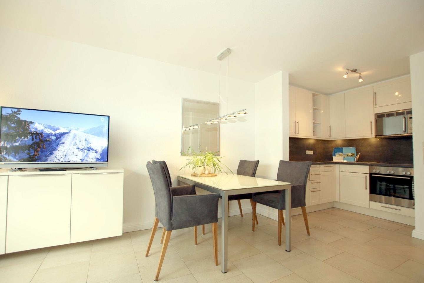 - Sehr komfortabel und schön eingerichtetes Wohnzimmer mit großer Couch, Essplatz für vier Personen, offener Küche mit allen Extras