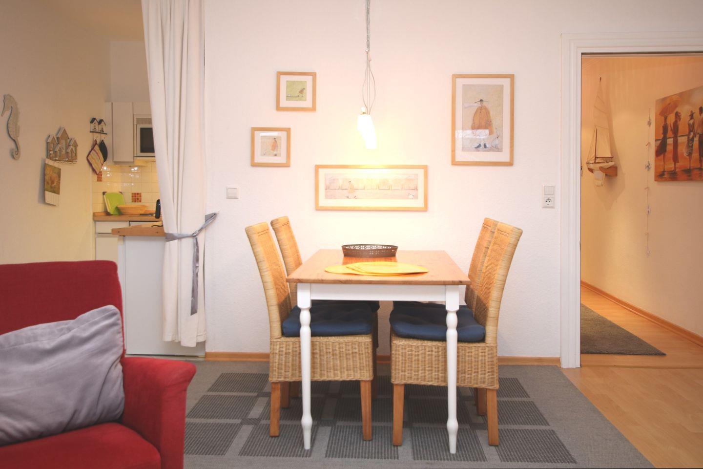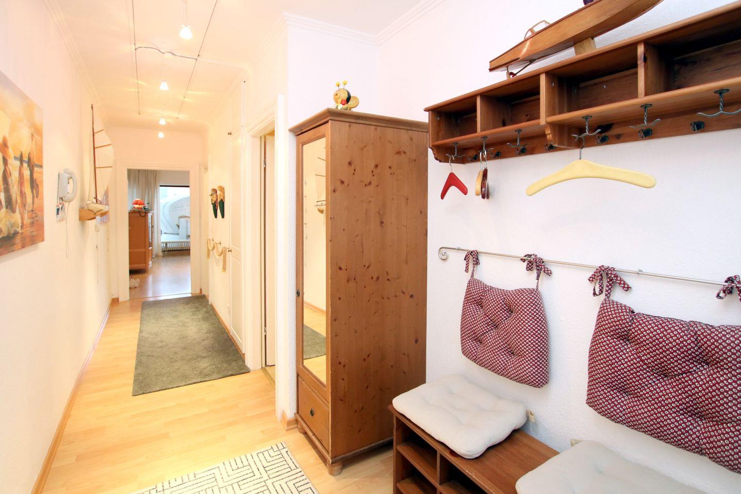 BALKON: Südseite 4 Gartenstühle, Strandkorb und 1 Liege. Die Wohnung ist vollständig mit Laminat ausgelegt. Eine sehr gemütliche und großzügige Wohnung in der Innenstadt. Die Wohnung ist liebevoll mit Accessoires und Bildern von den Eigentümern eingerichtet worden. Zum Strand sind es ca. 300 m Fußweg. Einkaufsmöglichkeiten in der Nähe. Ein Parkplatz ist nicht vorhanden. Zum Be- und Entladen ist es erlaubt in die Fußgängerzone zu fahren. Im Hof befindet sich ein ein überdachter Fahrradständer. Im Keller des Hauses finden Sie eine Waschmaschine und einen Trockner.