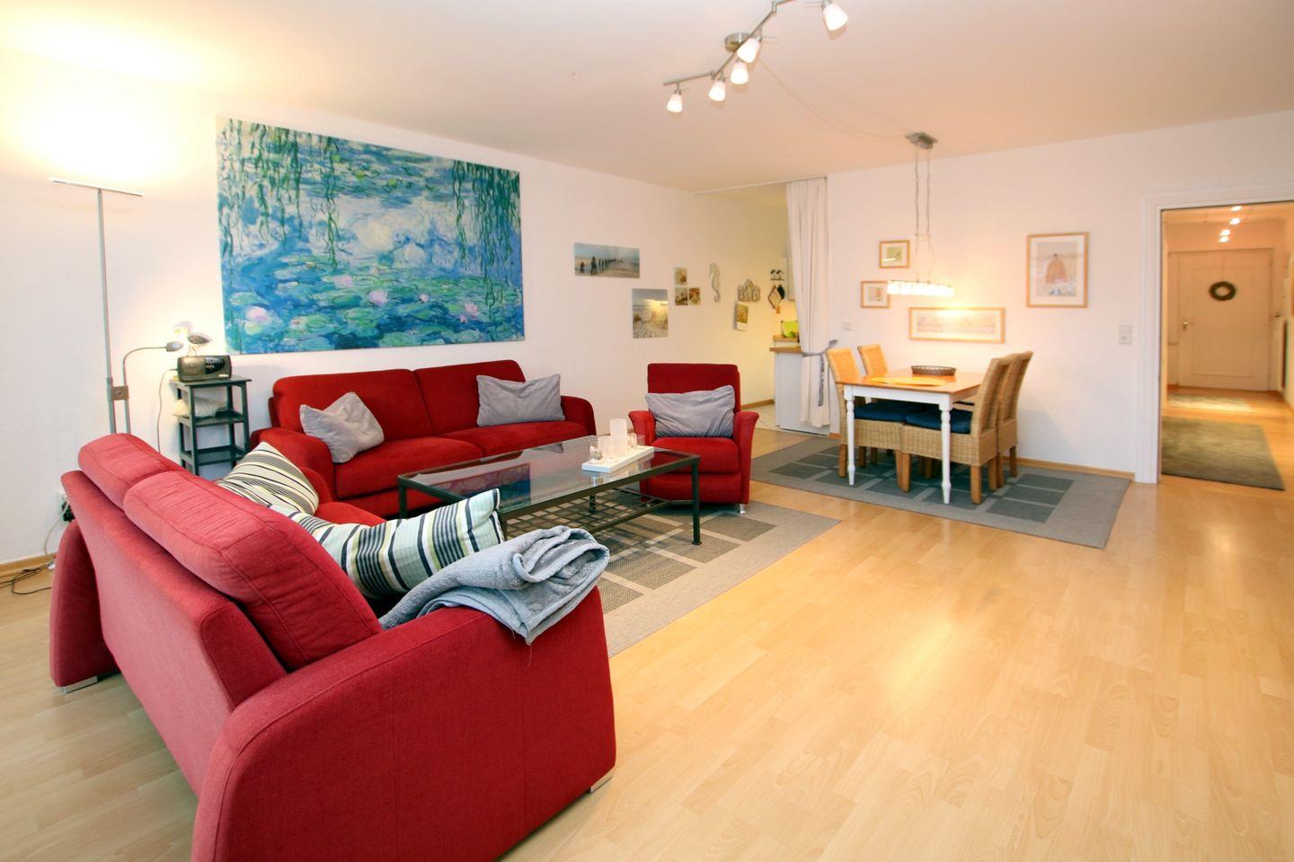 - Wohnzimmer mit 2 Sofas und 1 Sessel, Essplatz mit 4 Stühlen,