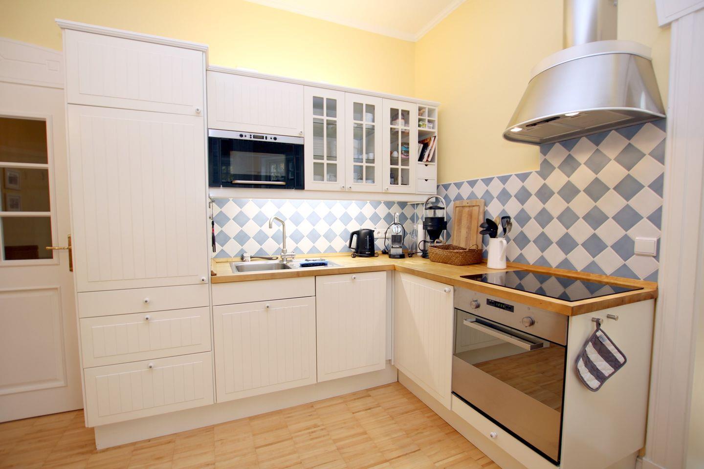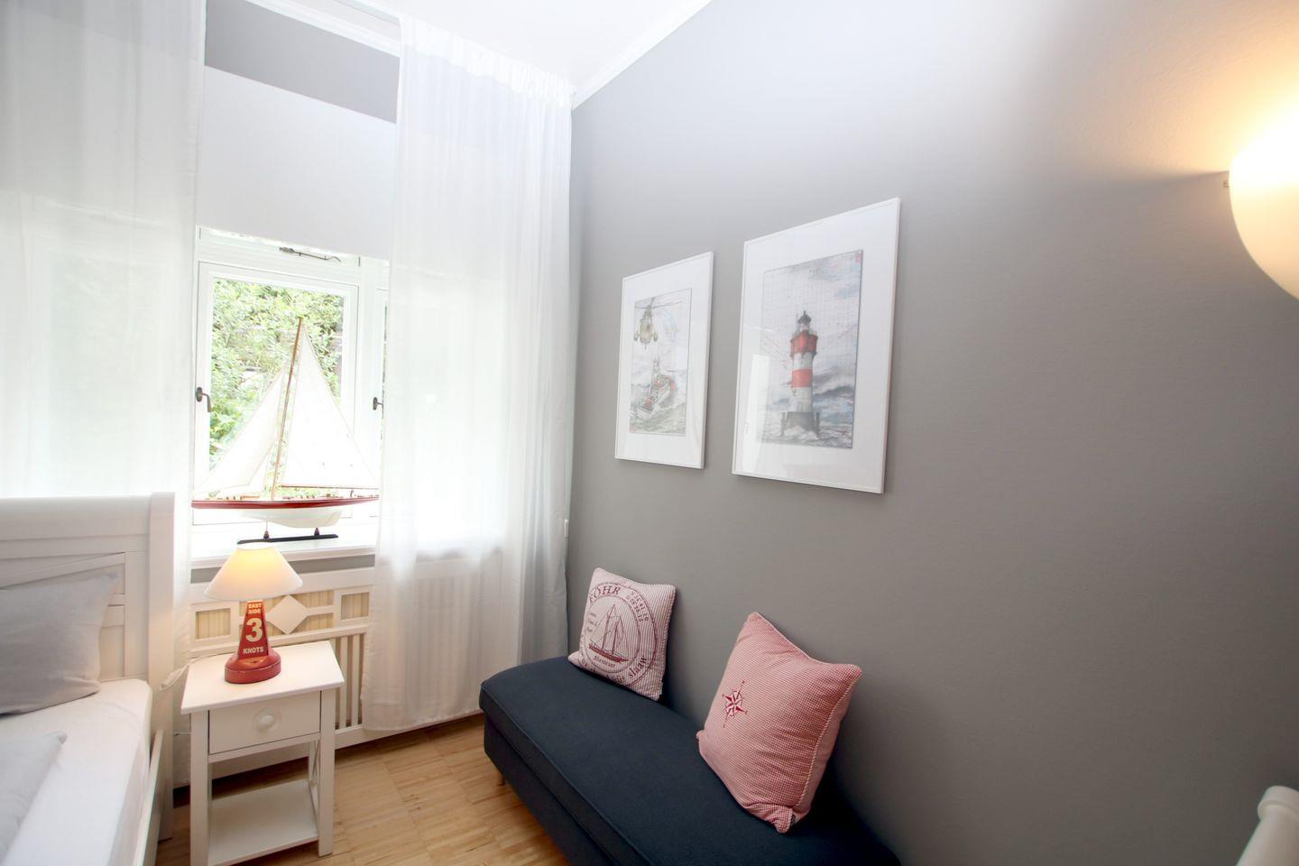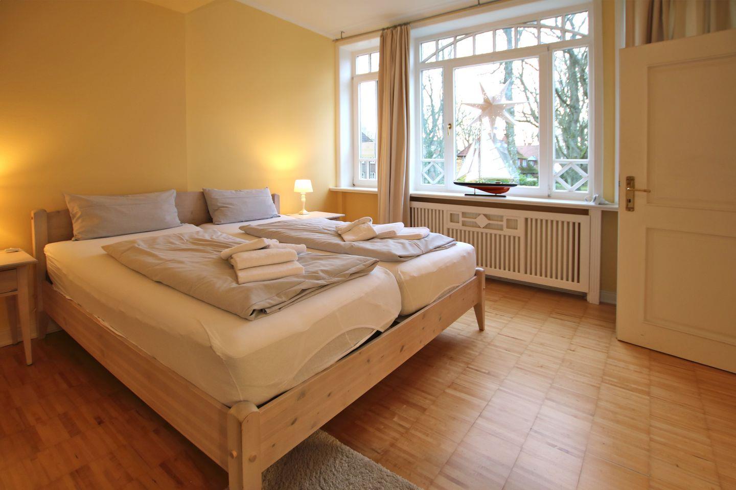 Dass auf der Insel Föhr nicht nur schöne Reetdachhäuser stehen, beweist dieses historische, im Stil der Bäderarchitektur, erbaute Haus aus dem Jahr 1910 (komplett saniert in 2006). Genießen Sie Ihren Urlaub im Haus Friedrichsen am Südstrand in ruhiger und strandnaher Lage. Ihre Unterkunft: Ferienwohnung in Wyk auf Föhr, Gmelinstraße 22, Wohnung Nr. 3 befindet sich im Hochparterre und ist über wenige Stufen leicht erreichbar. In dieser 3-Zimmer-Nichtraucherwohnung finden Sie auf ca. 75 m² Platz zum Wohlfühlen für 4 Personen. Die gehobene Ausstattung verbindet modernes Interieur mit historischem Ambiente. Die großzügige Fensterfront und der wohnliche Erker verleihen, Sommer wie Winter, ein „Balkonfeeling“! WOHNZIMMER: 2-er Sofa, 2 Sessel, großer FLAT-TV, Esstisch mit 4 Stühlen & Kinder-Hochstuhl und komfortable Küchenzeile. Zusätzlich zur der schon sehr gut ausgestatteten Küche gibt es noch einen Sandwich-Maker, ein Fondue-Set und ein Schoko-Fondue-Set. SCHLAFZIMMER 1: mit Doppelbett, FLAT-TV, begehbarem Kleiderschrank, sowie eine Lese-Ecke mit 2 Sesseln und einem Sekretär für die Urlaubspost und direkt angrenzendem BAD 1 mit Dusche, Waschtisch & WC SCHLAFZIMMER 2: mit zwei Einzelbetten, Kleiderschrank und zwei bequemen Korbsesseln. Dazugehörig BAD 2: mit Doppelwaschtisch, Dusche, WC und Bidet und 2. Haar-Föhn.