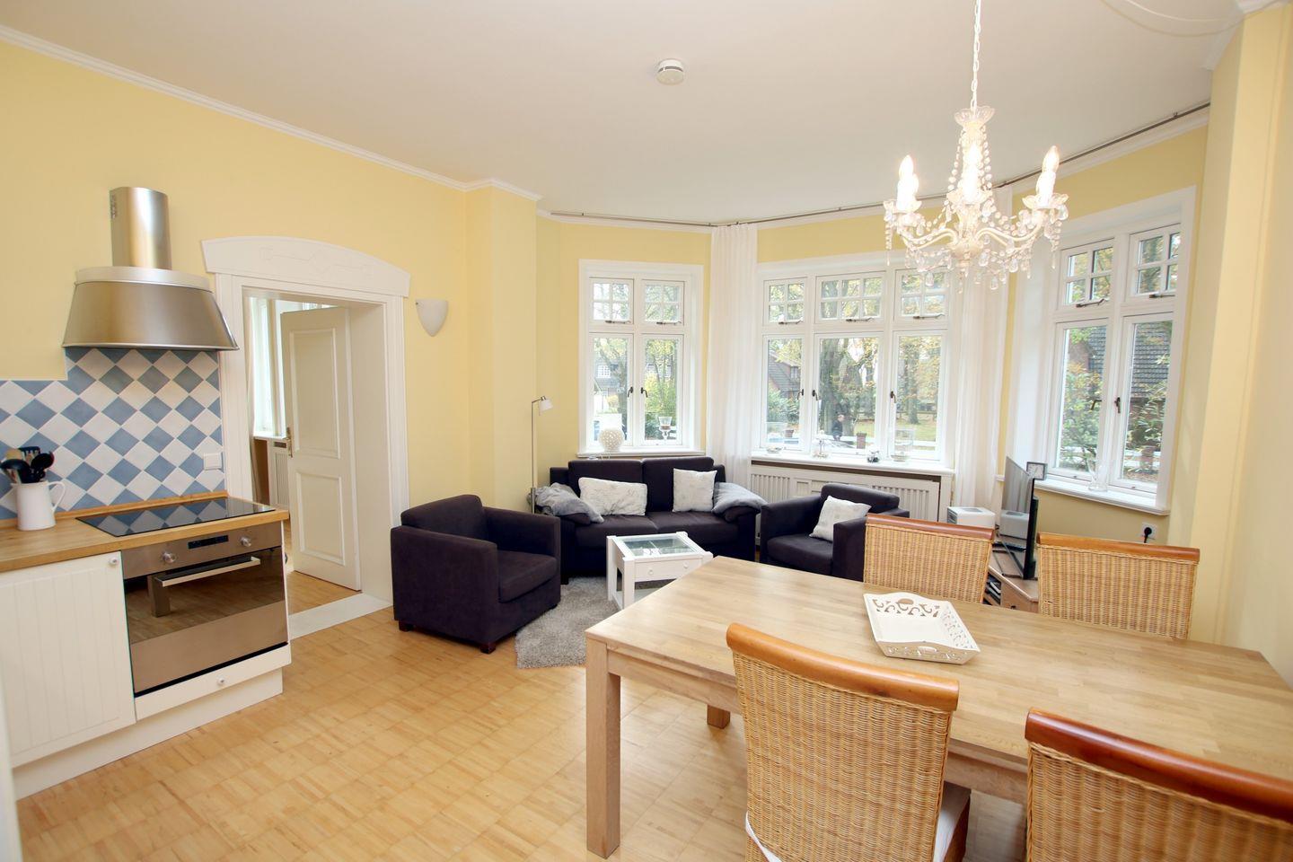 - Wohnzimmer mit 2-er Sofa, 2 Sesseln, Esstisch mit vier Stühlen,