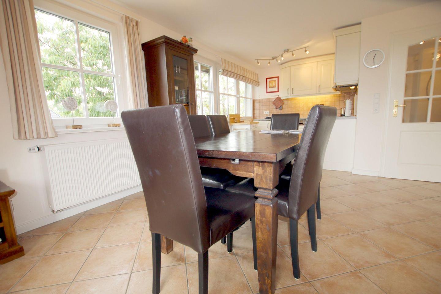 - Wohnzimmer mit Sitzgarnitur, Essplatz mit 6 Stühlen und einem Kaminofen.