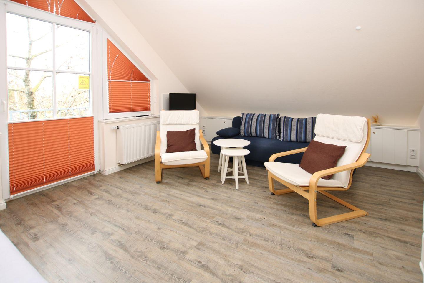 - Schlafzimmer 2 im Spitzboden mit Doppelbett, Couch, TV / DVD-Player