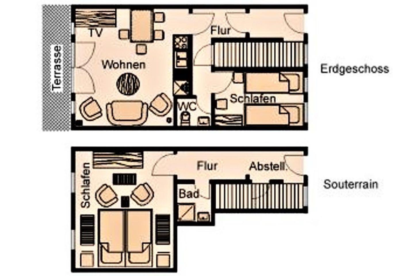 Ferienwohnung mit 3 Zimmern auf ca. 60m² über Erdgeschoß und Untergeschoß