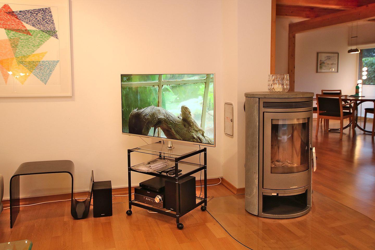 Das lichtdurchflutete WOHNZIMMER ist mit einer schönen großen Ledercouch über Eck, Sessel, Kaminofen, Flatscreen- TV und Kaminofen ausgestattet. Der Esstisch ist mit dem Platz für 5 Personen sehr großzügig.