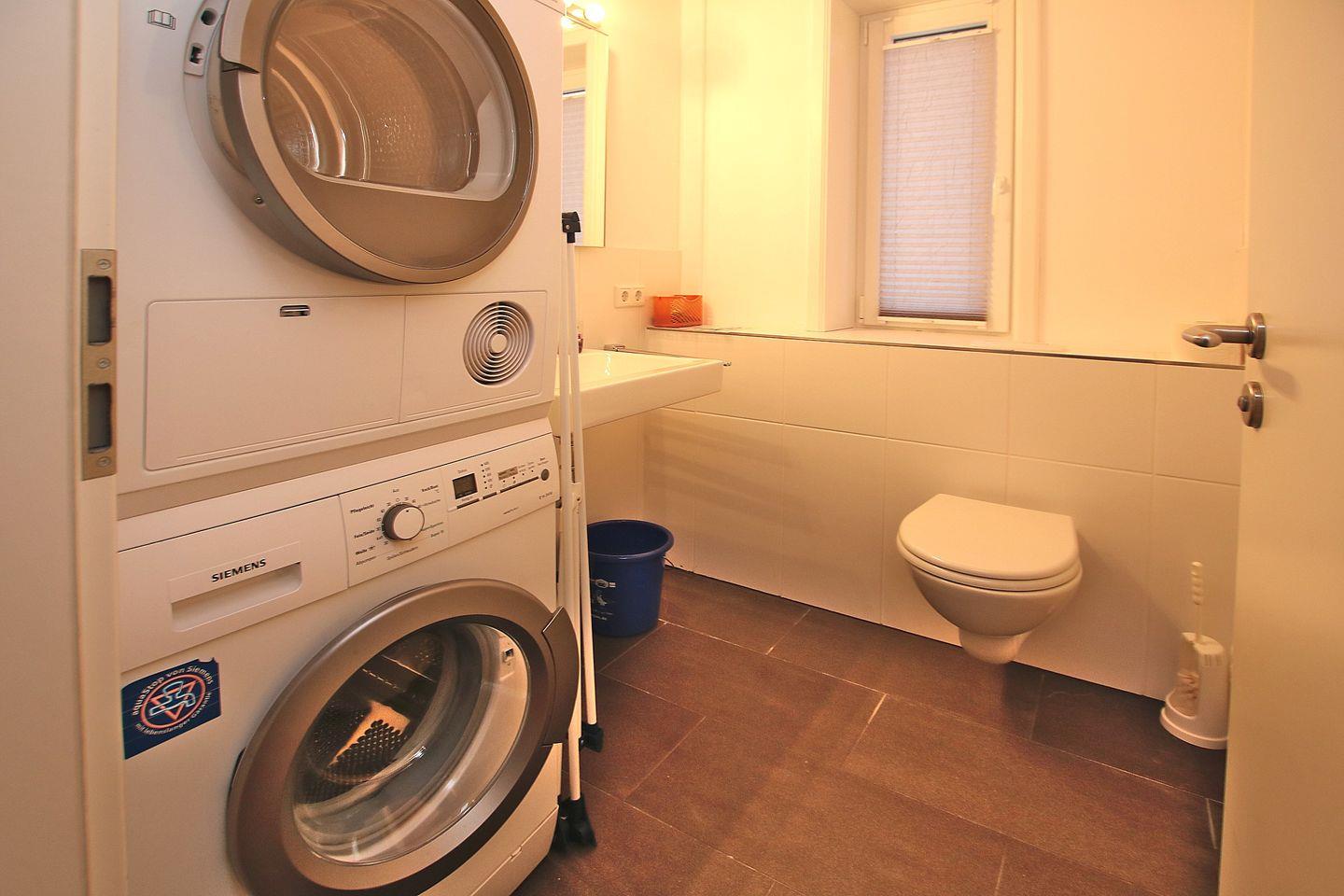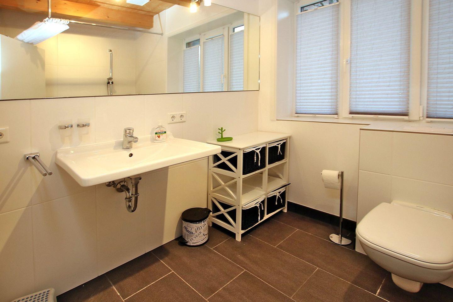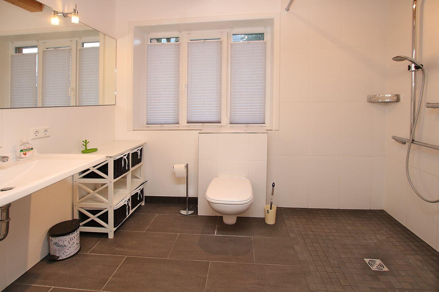 Das Badezimmer mit Dusche und WC ist auch für Rollstuhlfahrer recht gut geeignet. Im GÄSTE/WC sind Waschmaschine und Trockner für Sie untergebracht.