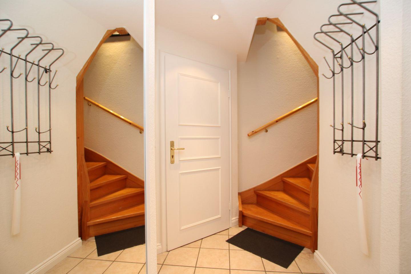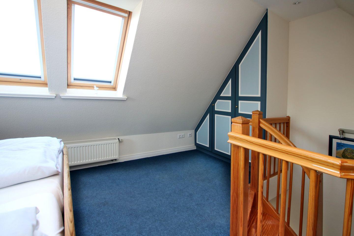 Vom Flur führt eine Treppe ins Galerieschlafzimmer 2: Doppelbett und eingebauter Kleiderschrank.