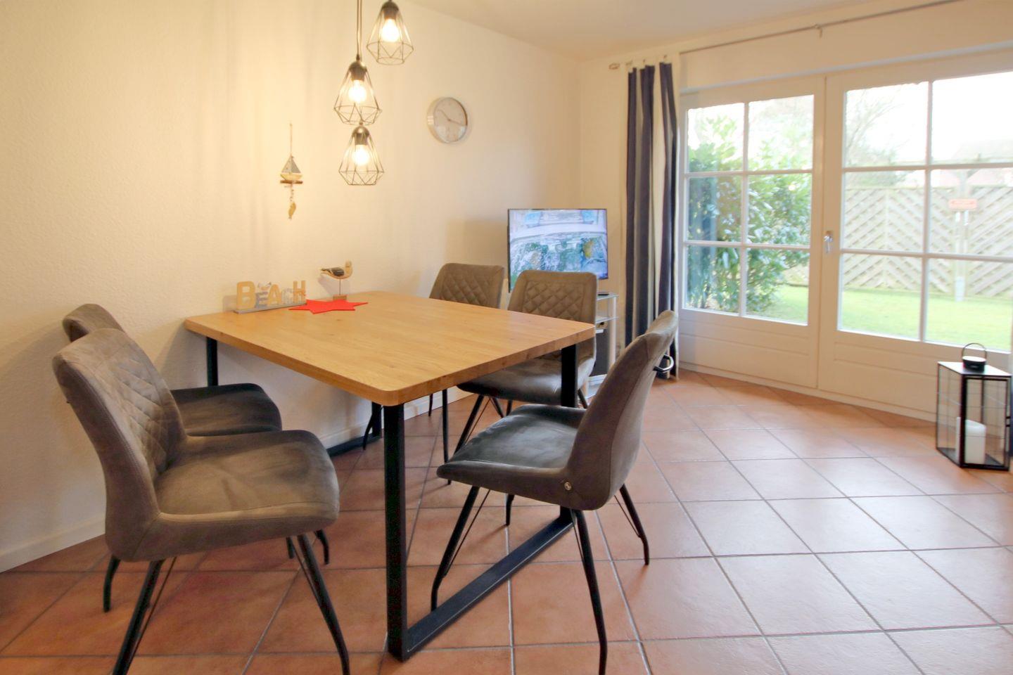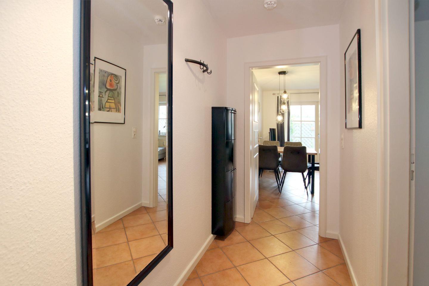 3-Zimmerwohnung mit ca. 60 qm im Erdgeschoß mit Südterrasse. WOHNZIMMER: Sitzecke (2 Sofas). KÜCHENZEILE mit Esstisch und 5 Stühlen. FLUR mit Garderobe und kl. Einbauschrank. Diese Räume sind alle mit Terracottafliesen ausgelegt. SCHLAFZIMMER 1 mit zwei getrennt stehenden Betten (0,80 x 2 m) und Kommode. SCHLAFZIMMER 2 mit Doppelbett und Kleiderschrank. Diese Zimmer sind mit Laminat ausgelegt. BAD: Dusche und WC. TERRASSE: großzügig mit Gartenmöbeln und Saison-Strandkorb (April-Oktober). LAGE: direkt im Zentrum, aber trotzdem sehr ruhig in zweiter Reihe. Die Parkplatzzufahrt ist an der Badestraße. Zum Zentrum sind es nur wenige Gehminuten, zum Hauptstrand ca. 300 m, zum Kurmittelhaus und dem Erlebnisbad ca. 700 m. Münzwaschmaschine und -Trockner stehen im Gemeinschaftskeller zur Verfügung. Die Eingangstür des Hauses ist ca.90cm breit.