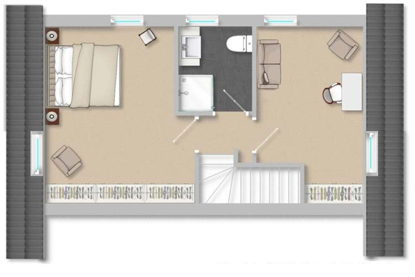 - Schlafzimmer mit 2 Einzelbetten, Kleiderschrank im OG, Aufenthaltsraum mit Schreibtisch, Sessel, Couch im OG