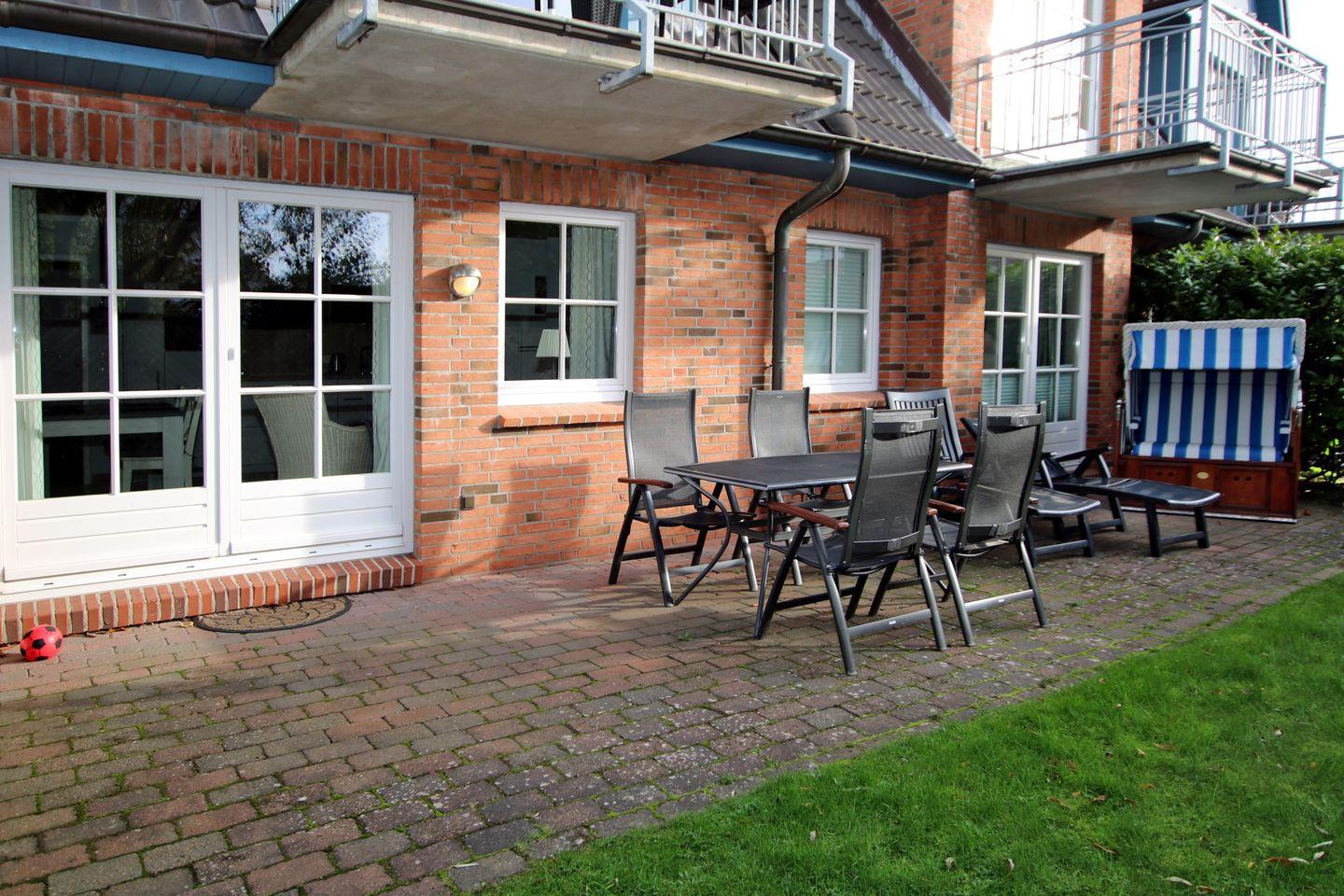 Sie verfügt über eine tolle große Südterrasse mit Gartenbereich, auf die man sowohl vom Wohnraum als auch vom Schlafzimmer Zugang hat. Ein schöner Strandkorb und Gartenmöbel stehen zur Verfügung. Der mit Terrakotta-Fliesen ausgelegte Wohn- und Essbereich ist u.a. ausgestattet mit einem gemütlichen Ledersofa, einem Esstisch mit 4 Stühlen und einer neuen modernen Küchenzeile mit Mikrowelle. Internetanschluss ist über WLAN gegeben.