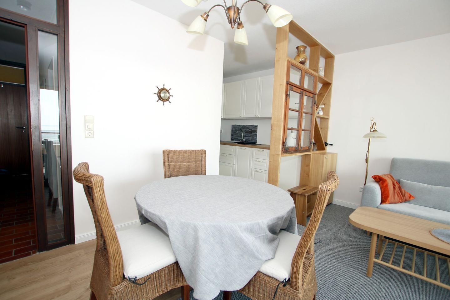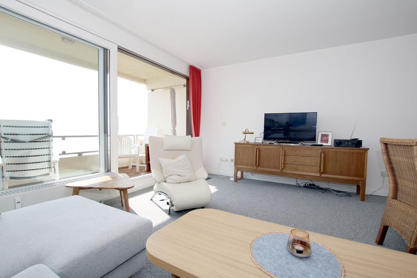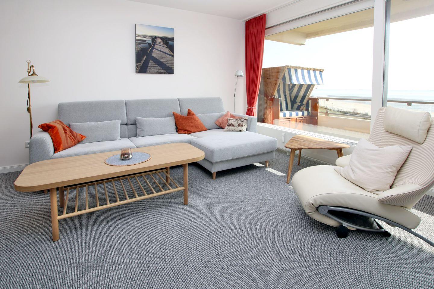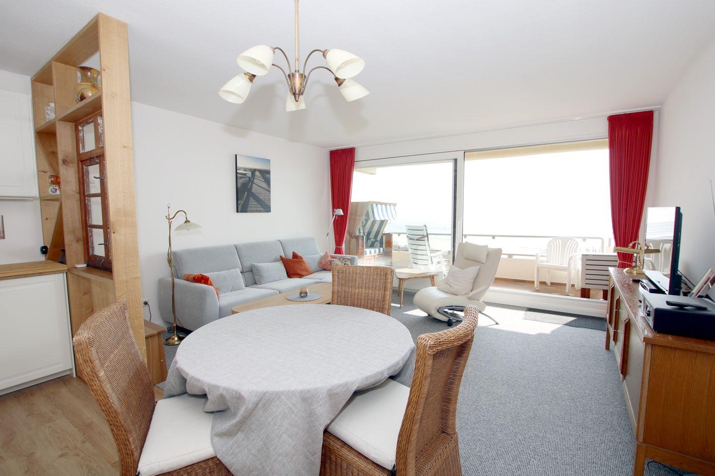 WOHNZIMMER: Couch und Designer Ledersessel, modern und gemütlich .Esstisch aus den 50iger Jahren mit 4 Korbstühlen und Teppichboden neu, Landhaus Küche in weiß und neu mit modernen Vinylboden, BAD mit Dusche und WC in 2018 modernisiert, mit Fliesen. Im Haus befinden sich ein Schwimmbad (kostenfrei) und eine Sauna (gegen Gebühr) Vom Balkon (Strandkorb, 4 Stühle und Tisch) haben Sie einen herrlichen Blick auf die See und die Halligen. Zum Strand ist es ca. 1/2 Minute. Zum Kurmittelhaus und in die Innenstadt sind es ca. 10 Minuten Fußweg. PKW-Stellplatz (A17) direkt vor dem Zugang zu dem seitlich gelegenen Eingang 5e.