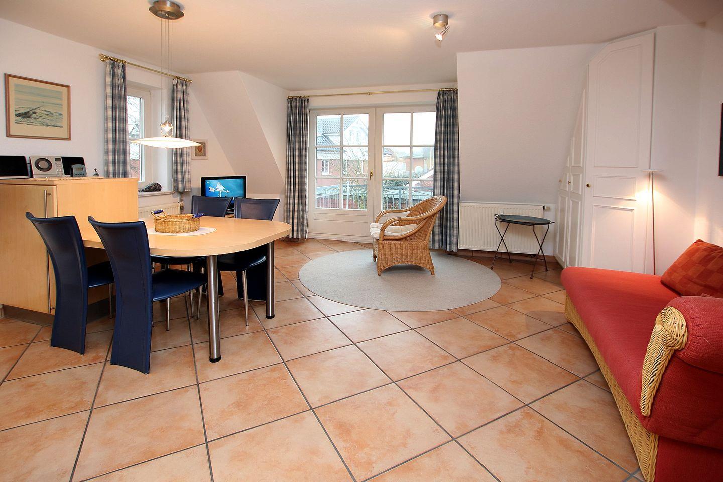 - Wohnzimmer mit Zweisitzer- Sofa und Sessel, Smart TV, Esstisch und vier Stühlen
