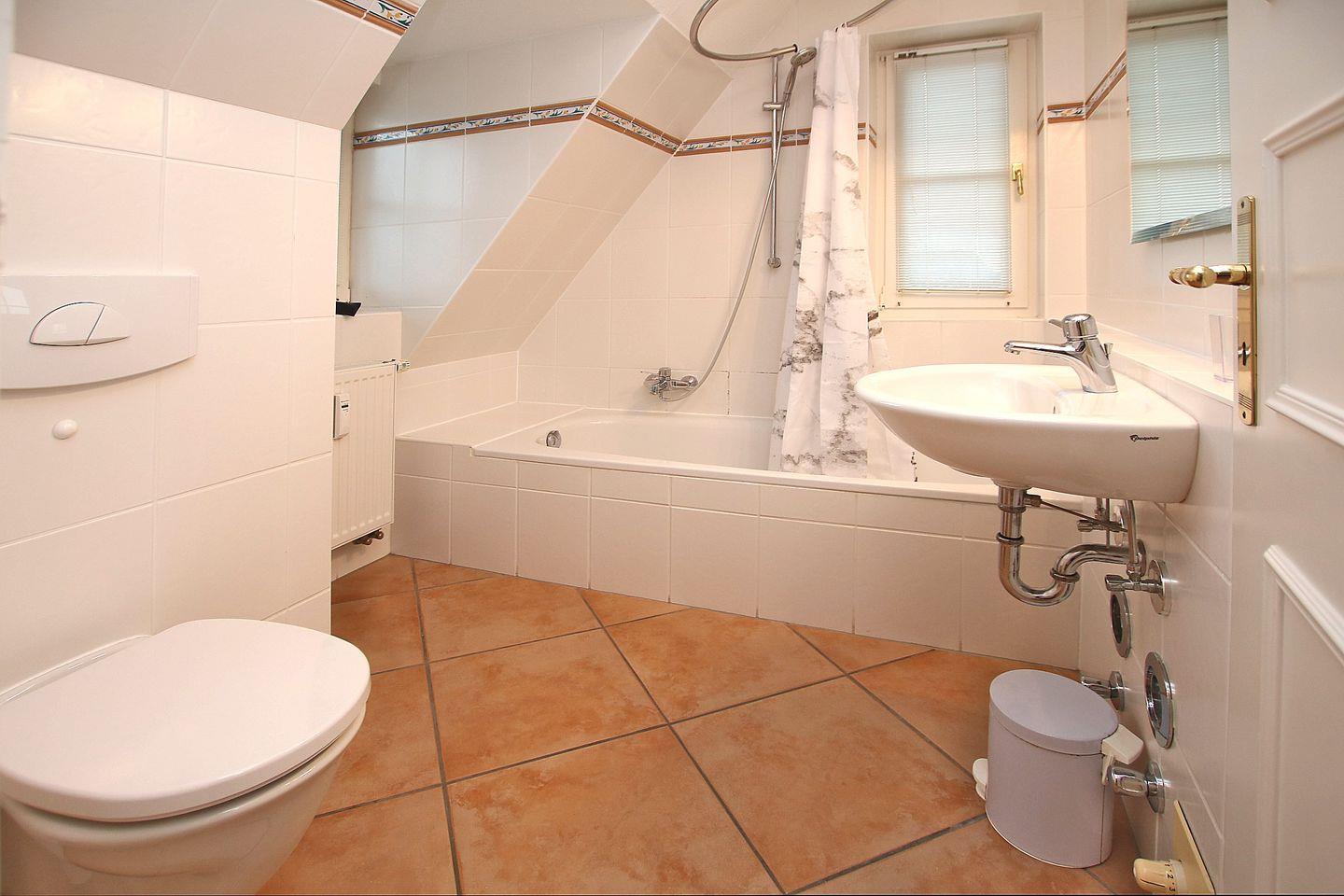 viel Komfort, Esstisch und 4 Stühlen. FLUR mit Garderobe. Diese Räume sind alle mit Fliesen ausgelegt. SCHLAFZIMMER im Spitzboden mit Doppelbett (2m x 2m) und Einbaukommode. Das Schlafzimmer hat Teppich. BAD mit Wanne/Duschvorhang und WC. Zum Zentrum sind es nur wenige Gehminuten, zum Hauptstrand ca. 300 m, zum Kurmittelhaus und Erlebnisbad ca. 700 m. LAGE: direkt im Zentrum, aber trotzdem sehr ruhig in zweiter Reihe. Waschmaschine und Trockner auf Münzbasis im Gemeinschaftskeller.