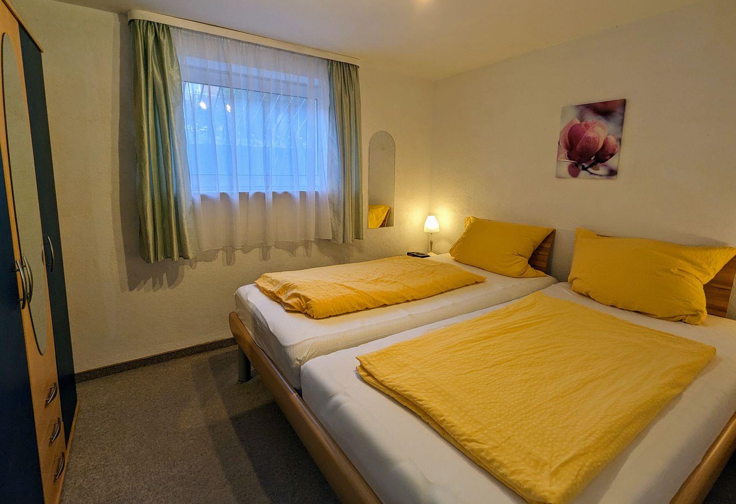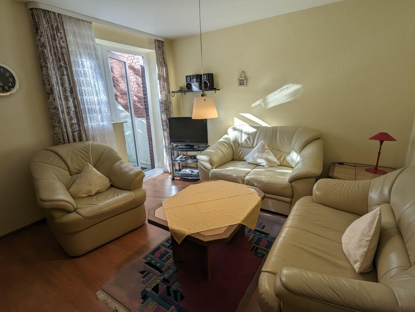 Diese Wohnung ist wie folgt aufgeteilt: WOHNBEREICH (ein Sofa, 2 Sessel, ein Couchtisch, Sat-TV, CD-Player, kostenloses Internet), kleine Süd-West-Terrasse mit Gartenmöbel, vollausgestattete WOHNKÜCHE mit Essbereich (u.a. Esstisch mit 4 Stühlen, Geschirrspüler, Mikrowelle, Backofen, Ceranfeld, Kühlschrank mit Gefrierfach, Kaffeemaschine, Toaster, Eierkocher, Besteck und Töpfe), SCHLAFZIMMER mit einem Doppelbett (180 x 200 cm) und einem Kleiderschrank, ein zweites SCHLAFZIMMER mit einem Einzelbett und einem Kleiderschrank, BADEZIMMER mit Dusche, Fenster, WC, Handtuchwärmer, Waschbecken, Spiegelschrank und Föhn, FLUR mit einer kleinen Garderobe für Jacken und Schuhe. Zur Wohnung gehört ein Parkplatz am Haus.