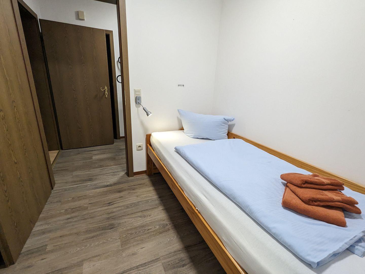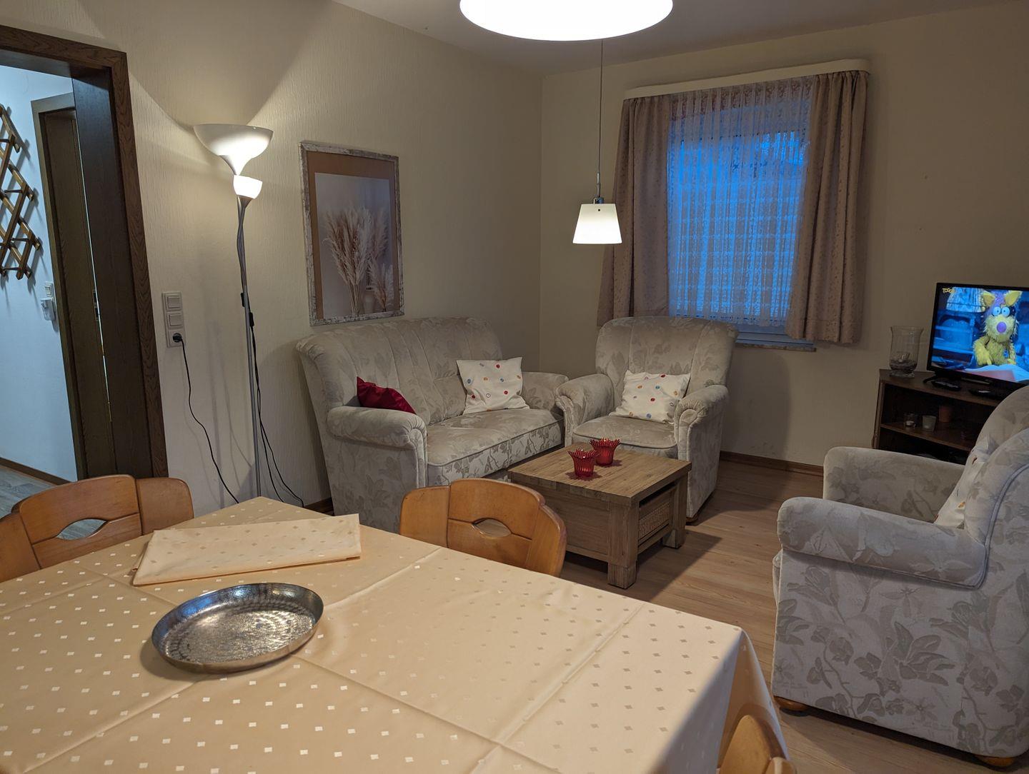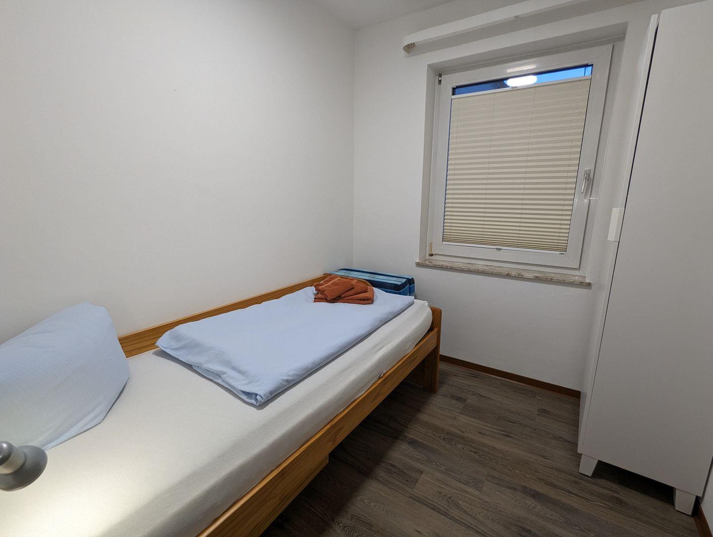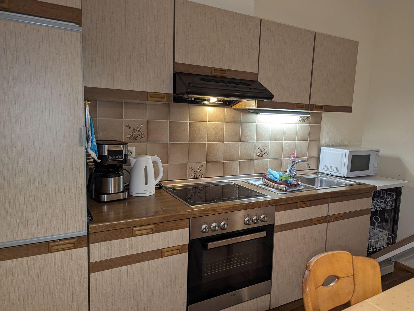 Diese Wohnung ist wie folgt aufgeteilt: WOHNBEREICH (ein Sofa, 2 Sessel, ein Couchtisch, Sat-TV, CD-Player, kostenloses Internet), Süd-West-Terrasse mit Gartenmöbel und Gartenblick, vollausgestattete WOHNKÜCHE mit Essbereich (u.a. Esstisch mit 4 Stühlen, Geschirrspüler, Mikrowelle, Backofen, Ceranfeld, Kühlschrank mit Gefrierfach, Kaffeemaschine, Toaster, Eierkocher, Besteck und Töpfe), SCHLAFZIMMER mit einem Doppelbett (180 x 200 cm) und einem Kleiderschrank, ein zweites SCHLAFZIMMER mit einem Einzelbett und einem Kleiderschrank, BADEZIMMER mit Dusche, Fenster, WC, Handtuchwärmer, Waschbecken, Spiegelschrank und Föhn, FLUR mit einer kleinen Garderobe für Jacken und Schuhe. Zur Wohnung gehört ein Parkplatz am Haus.