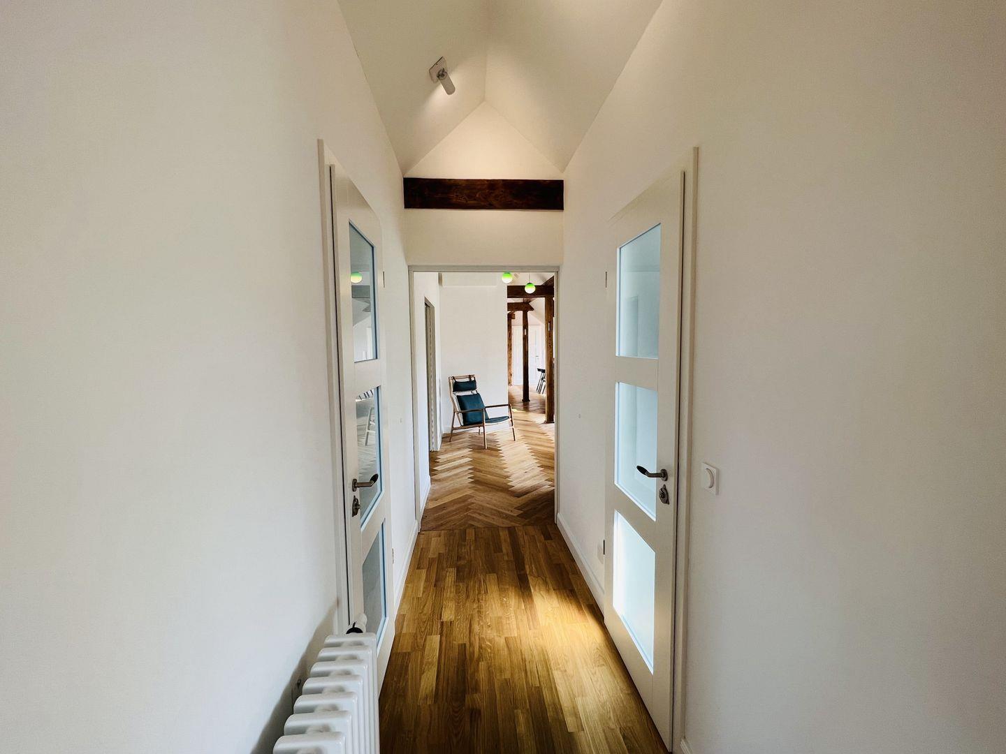 Die Ferienwohnung ist vollständig im Dachgeschoss gelegen und verfügt über einen großzügigen Wohn- und Essbereich mit offener Küche, zwei Schlafzimmer mit Doppelbett, ein Vollbad und ein Duschbad sowie ein separates Lese- und Arbeitszimmer. Über den Essbereich gelangen Sie direkt auf den eigenen Balkon mit Blick in die Natur.
