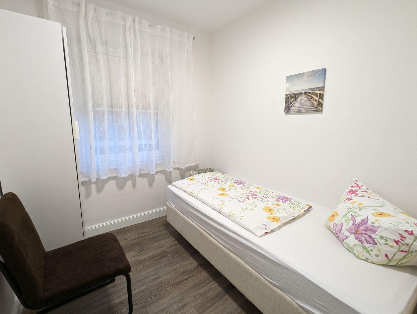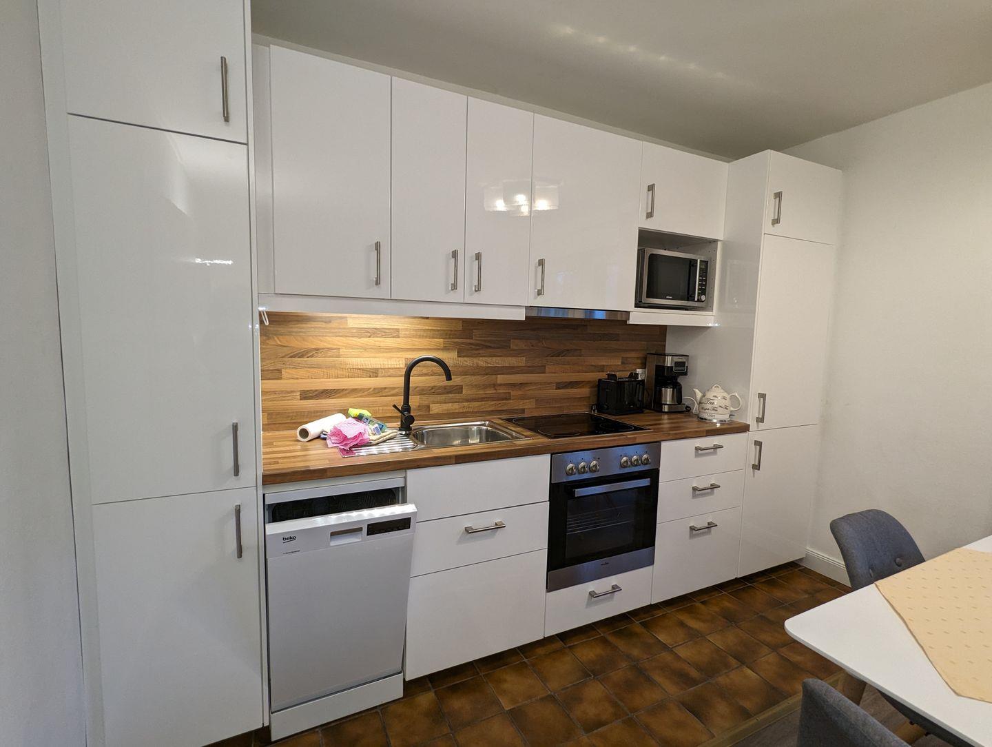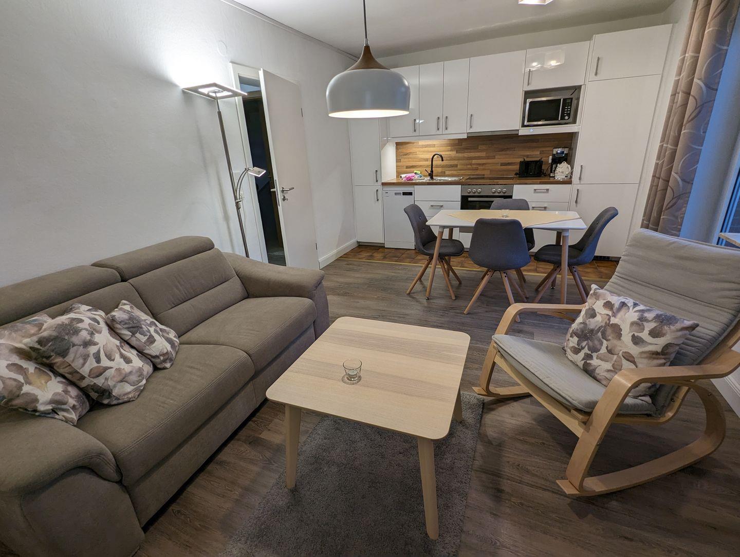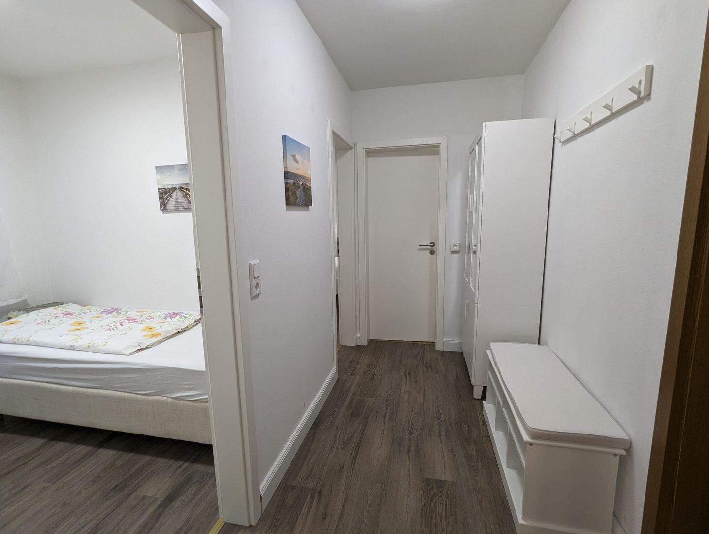 Es ist wie folgt aufgeteilt: WOHNBEREICH (ein Sofa, ein Sessel, ein Couchtisch, Sat-TV, CD-Player, kostenloses Internet), West-BALKON mit Gartenmöbel und Gartenblick, vollausgestattete WOHNKÜCHE mit Essbereich (u.a. Esstisch mit 4 Stühlen, Geschirrspüler, Mikrowelle, Backofen, Ceranfeld, Kühlschrank mit Gefrierfach, Kaffeemaschine, Toaster, Eierkocher, Besteck und Töpfe), SCHLAFZIMMER mit einem Doppelbett (180 x 200 cm) und einem Kleiderschrank, ein zweites SCHLAFZIMMER mit einem Einzelbett und einem Kleiderschrank, BADEZIMMER mit Dusche, Fenster, WC, Handtuchwärmer, Waschbecken, Spiegelschrank und Föhn, FLUR mit einer Garderobe für Jacken und einem Schuhschrank. Zur Wohnung gehört ein Parkplatz direkt am Haus. Von beiden Schlafzimmern haben Sie einen schönen Blick zum Hafen.