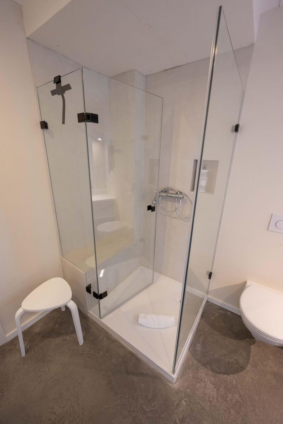 Im Erdgeschoss befinden sich der großzügige Wohn- und Essbereich mit offener Küche sowie das Duschbad. Sowohl über die Küche als auch über das Duschbad gelangen Sie direkt auf die überdachte Terrasse im blickgeschützten Innenhof.