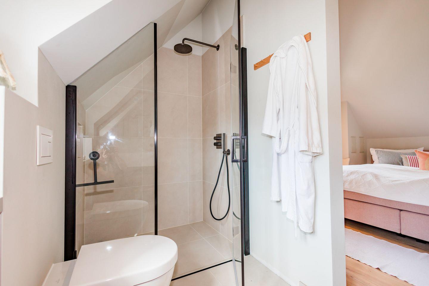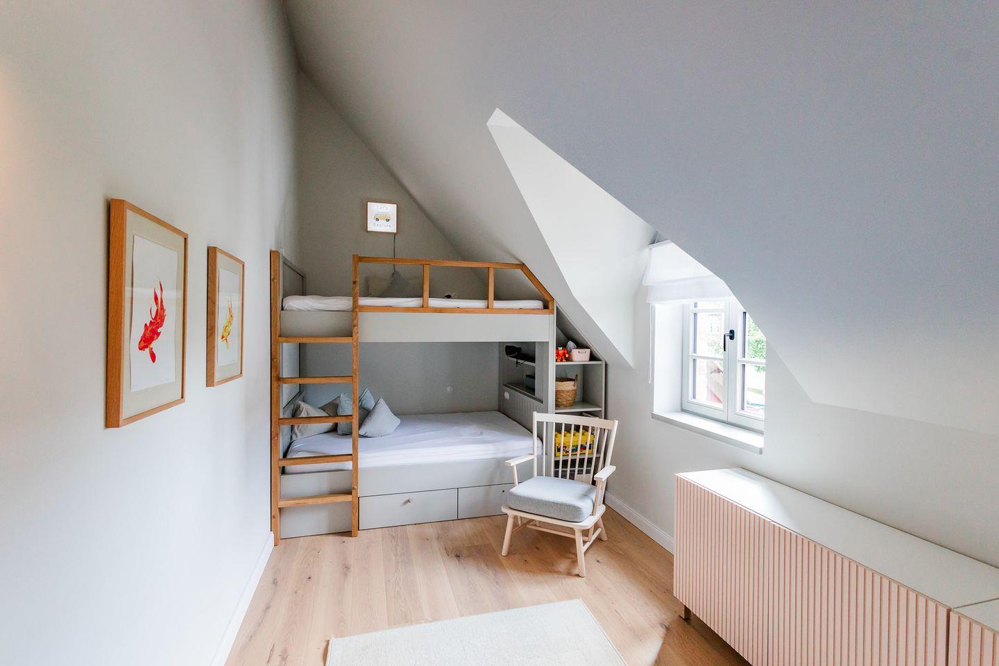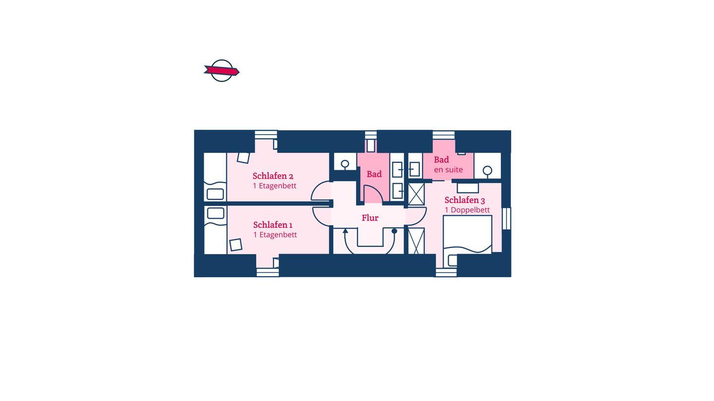 Im Obergeschoss sind die drei Schlafzimmer - eines davon mit Doppelbett und Duschbad en Suite - sowie ein zusätzliches Duschbad gelegen. Die beiden weiteren Schlafzimmer verfügen jeweils über ein Etagenbett (Breite 1,40 m).