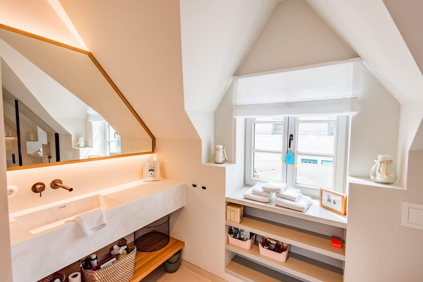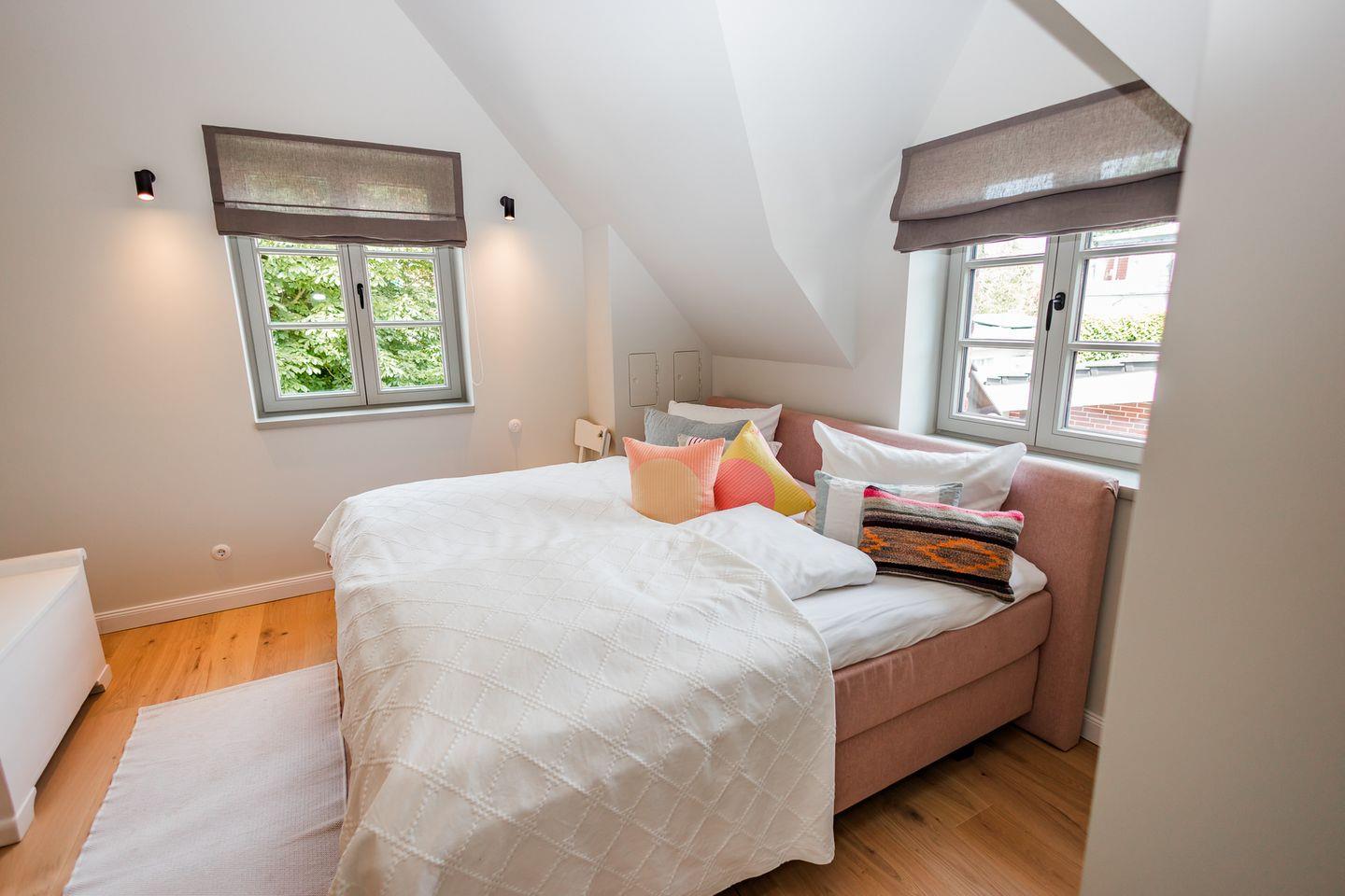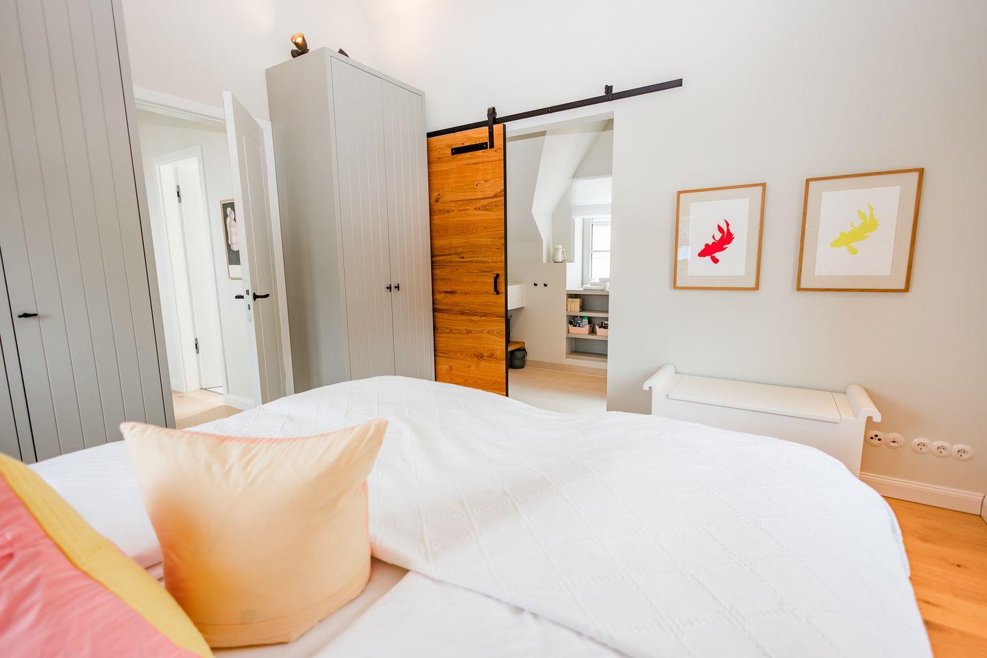 Im Obergeschoss sind die drei Schlafzimmer - eines davon mit Doppelbett und Duschbad en Suite - sowie ein zusätzliches Duschbad gelegen. Die beiden weiteren Schlafzimmer verfügen jeweils über ein Etagenbett (Breite 1,40 m).