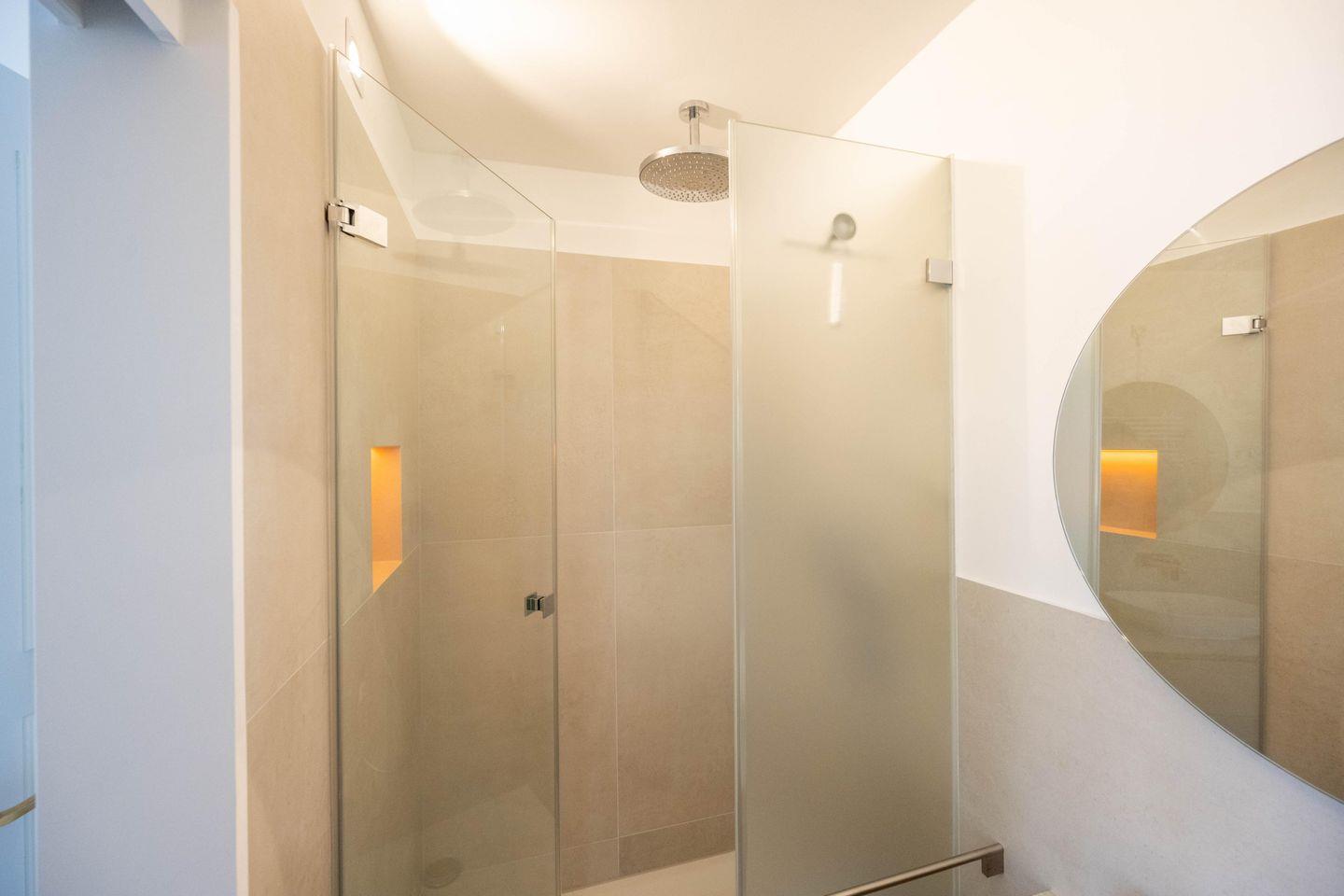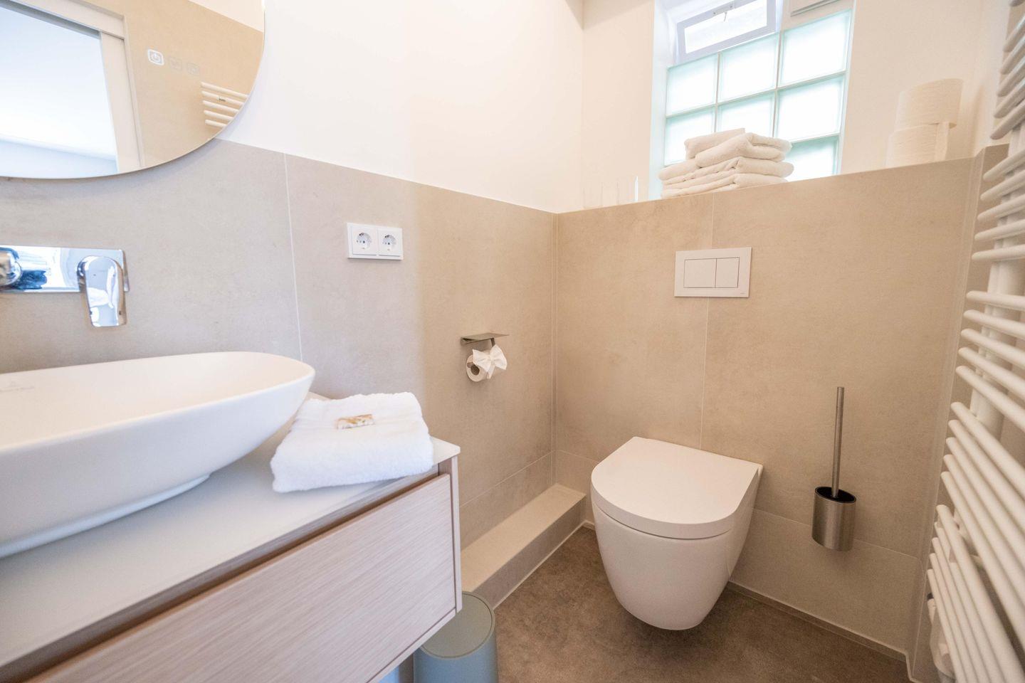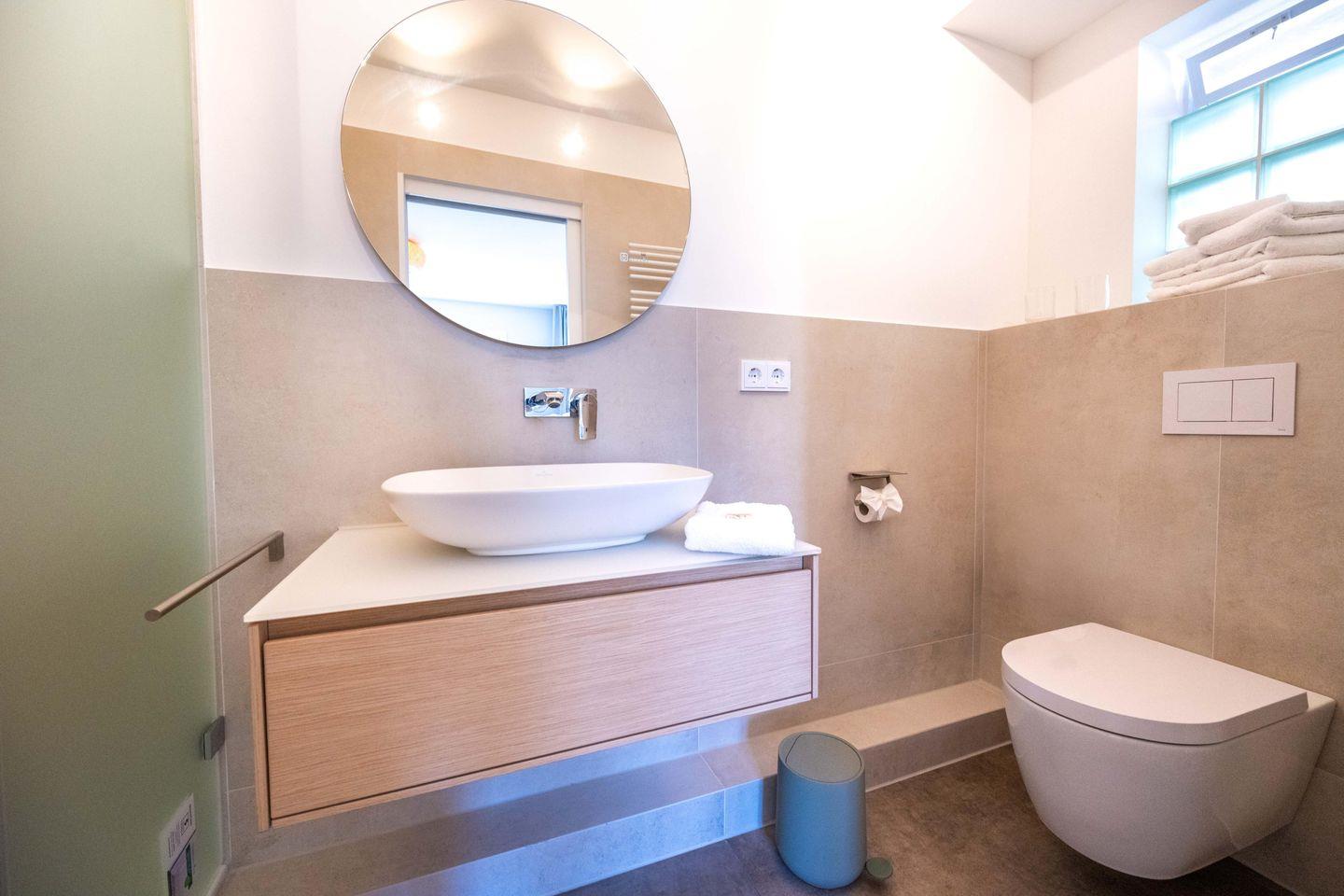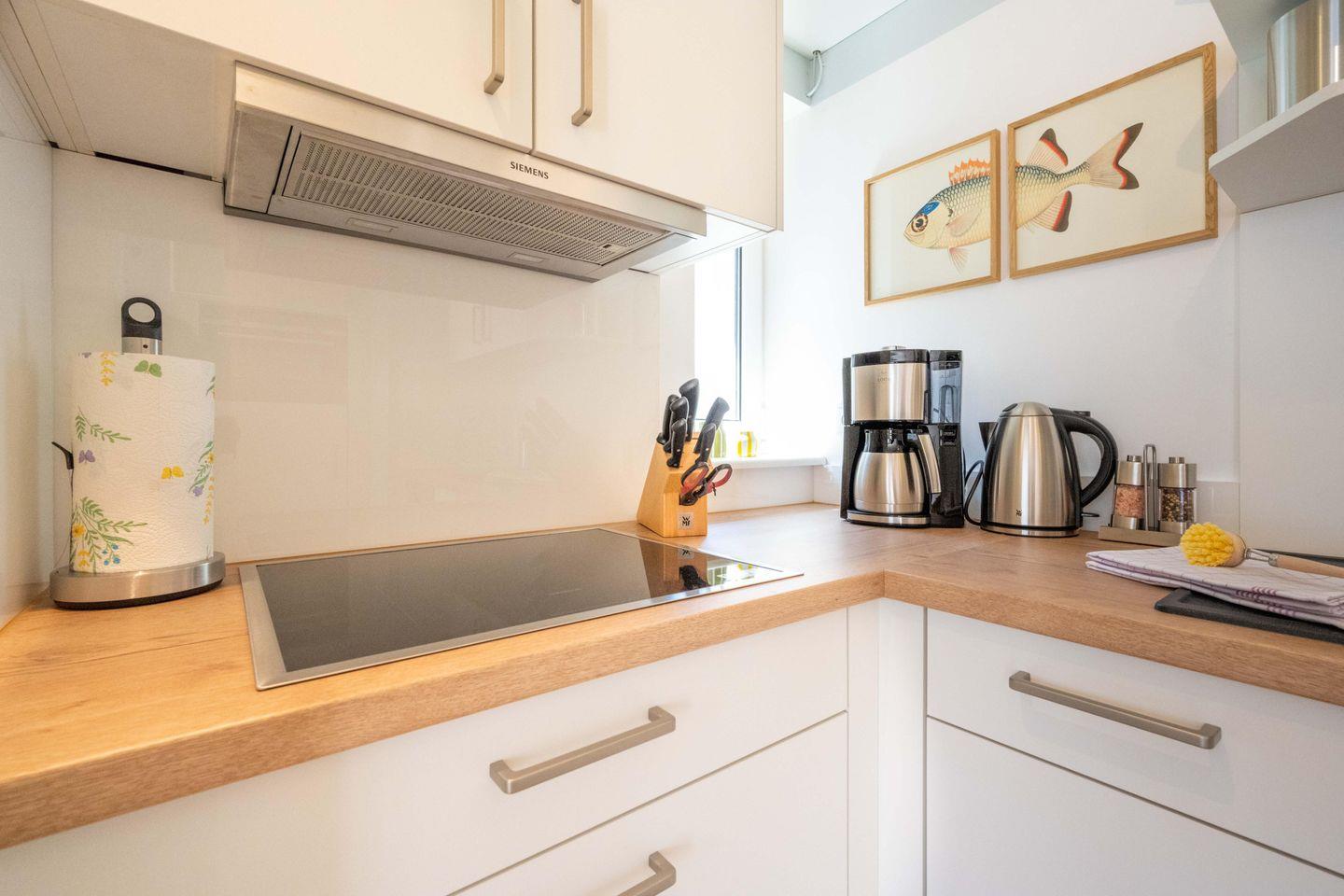Die Ferienwohnung ist komplett im Obergeschoss gelegen und verfügt über einen Wohn- und Essbereich mit offener Küche, ein Schlafzimmer mit Doppelbett und ein Bad mit Raindance-Dusche. Über den Wohnbereich gelangen Sie auf den eigenen Balkon, der zur Promenade ausgerichtet ist. Ältere Kinder finden im Wohnraum einen gemütlichen Schlafplatz: Die große Couch lässt sich zu einem Bett ausklappen. Zu den Gemeinschaftsbereichen des Hauses zählen eine eigene Sauna, ein Fitnessraum sowie ein Fahrradunterstand mit E-Bike-Ladestationen im Innenhof.