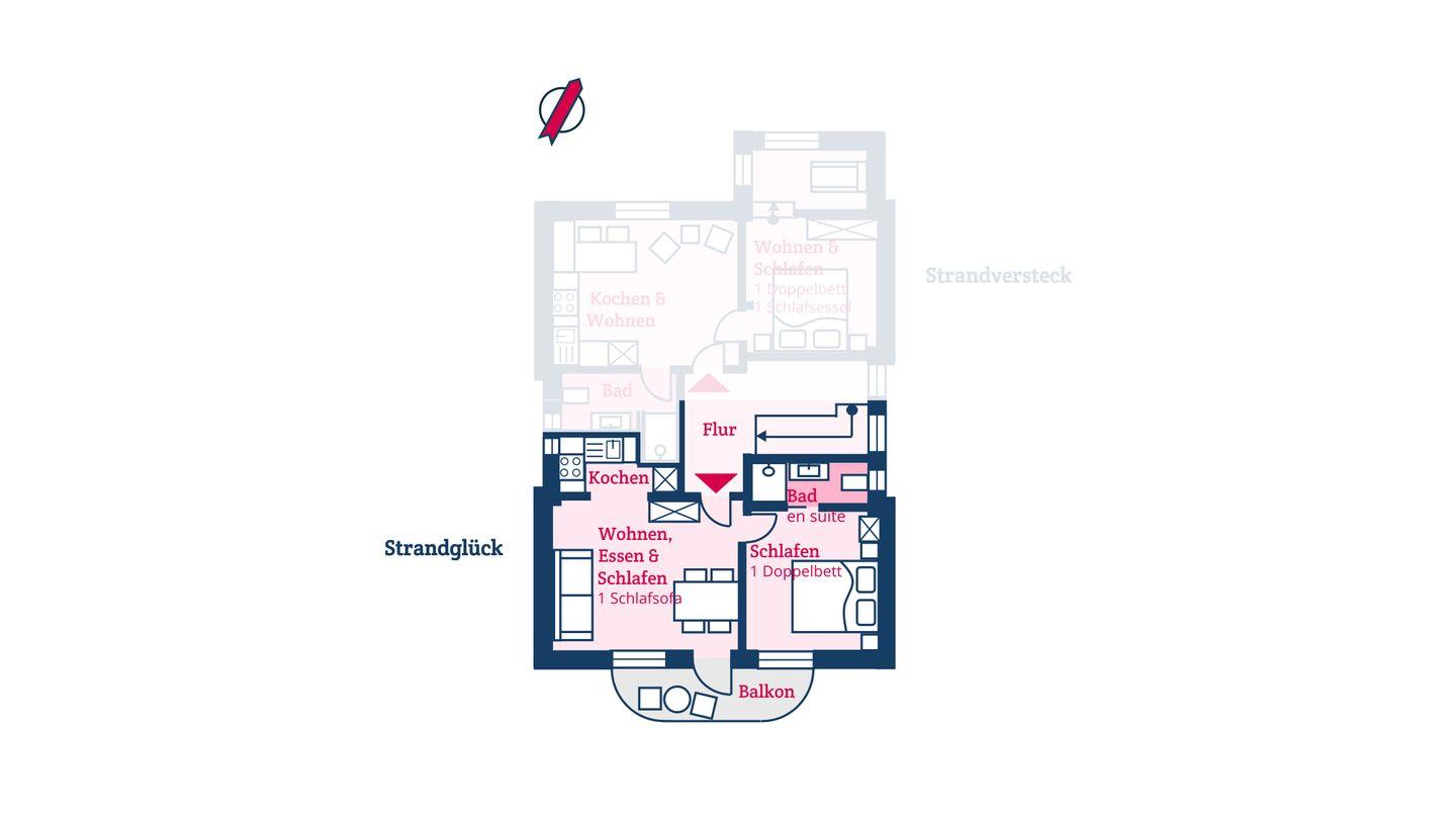 Die moderne Ferienwohnung Strandglück im alten Kapitänshaus wurde im Jahr 2024 aufwendig renoviert und verfügt über 1 Schlafzimmer und 1 Bad und bietet somit komfortabel Platz für bis zu 2 Erwachsene zuzüglich einer Kleinkinderaufbettung. Kleine und mittelgroße Hunde sind auf Anfrage herzlich willkommen.