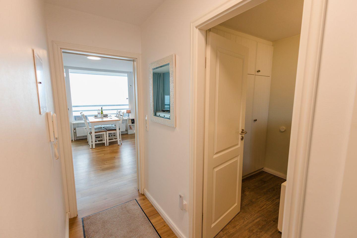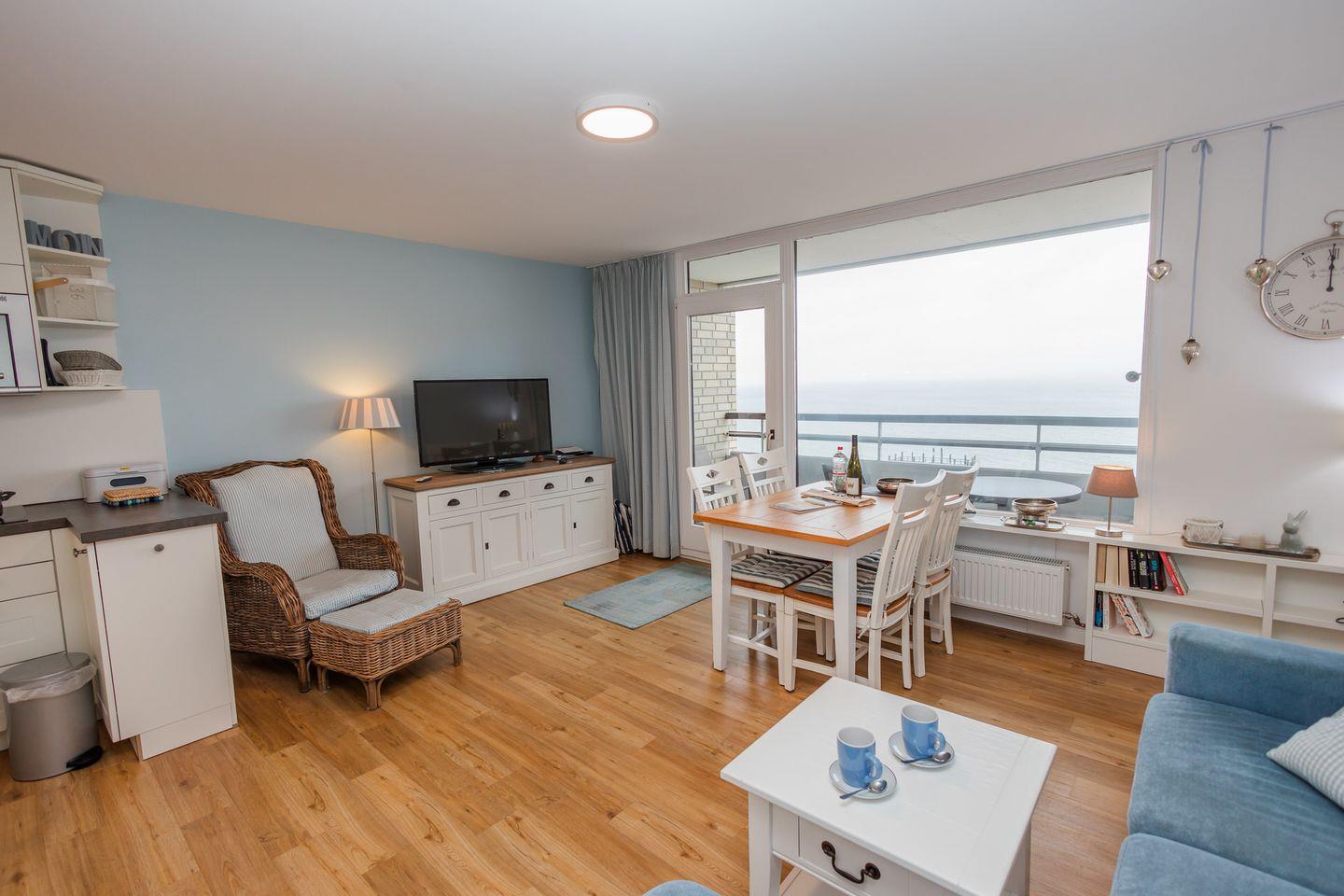 Die 2-Zimmer-Wohnung befindet sich im fünften Obergeschoss und unterteilt sich in einen gemütlichen Wohn- und Essbereich mit offener Küche, ein Duschbad sowie ein Schlafzimmer mit zwei Einzelbetten. Über den Wohnbereich gelangen Sie auf den eigenen überdachten Balkon.