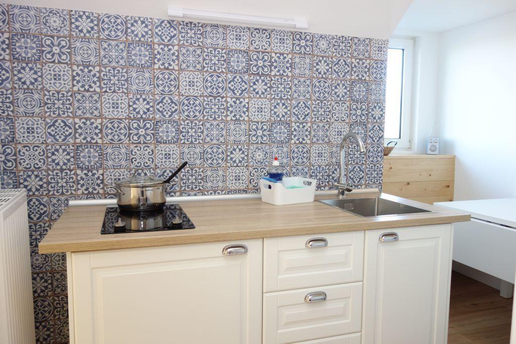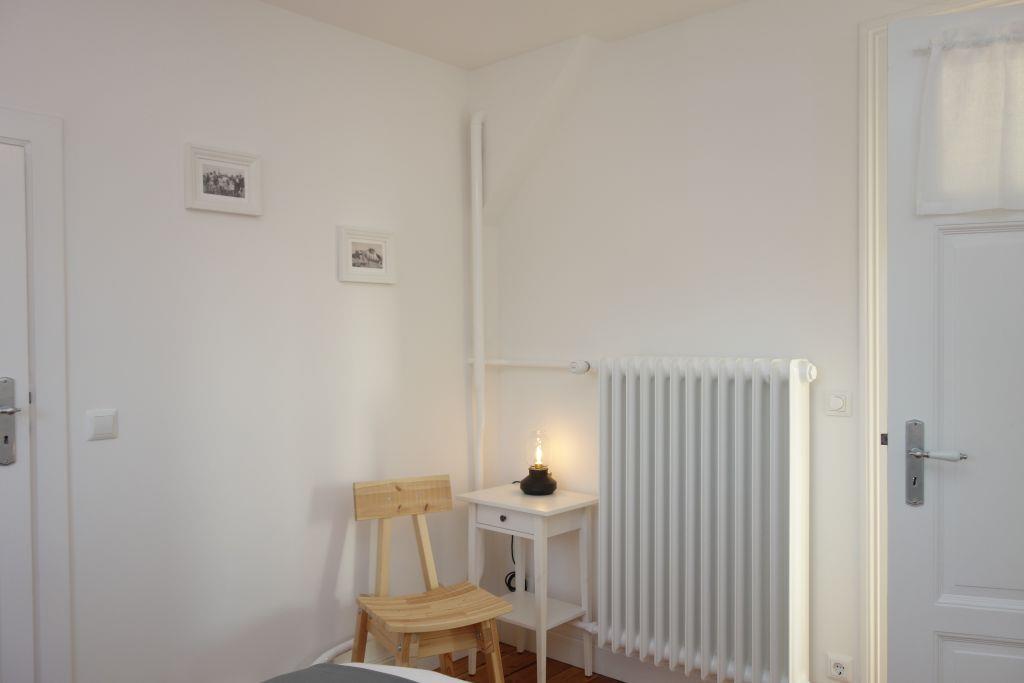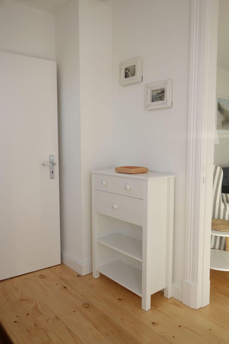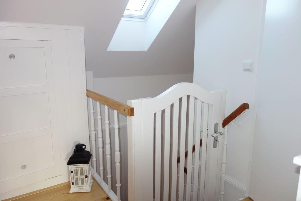 Die Villa beherbergt zwei Wohneinheiten, darunter die gemütliche Obergeschoss-Wohnung, die Platz für bis zu drei Personen bietet. Helle Farben, natürliche Materialien und eine stilvolle Einrichtung schaffen eine einladende Atmosphäre. Die Wohnung verfügt über ein komfortables Wohnzimmer, eine kompakte, aber gut ausgestattete Küche, zwei behagliche Schlafzimmer, ein großzügiges Duschbad und einen einladenden Flur.